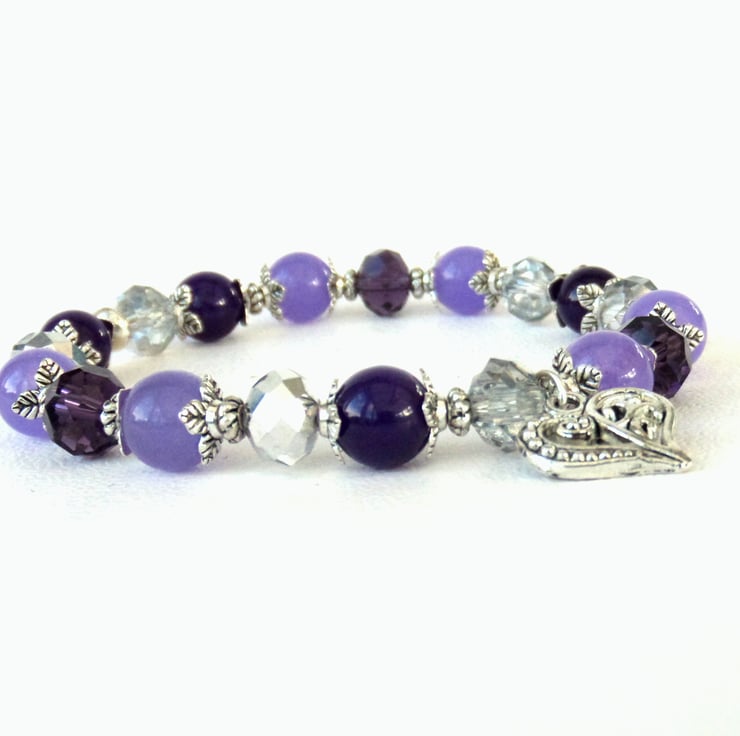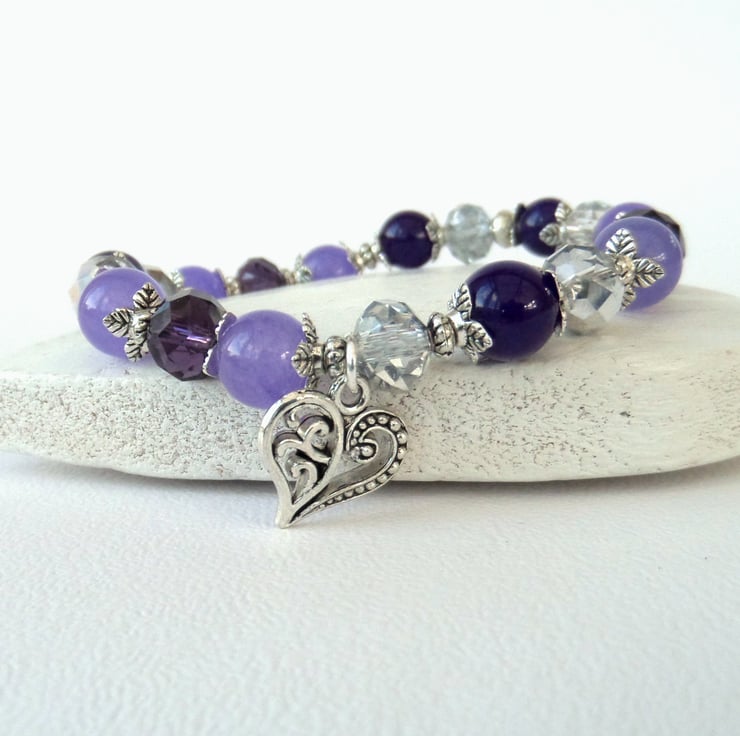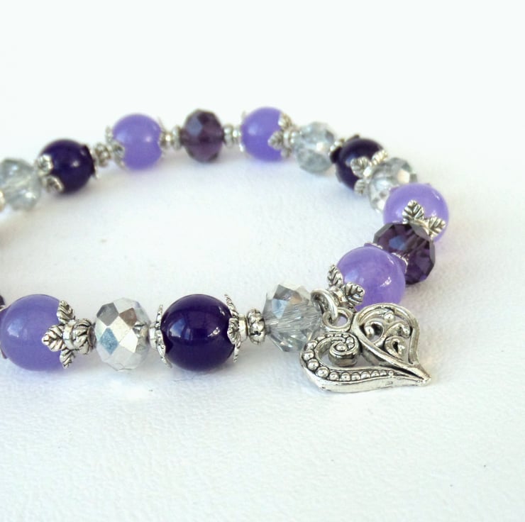 This gemstone bracelet is made with a mix of colours and stones - purple / lavender alexandrite and jade, silver hematite & purple crystal and tibetan silver beads.