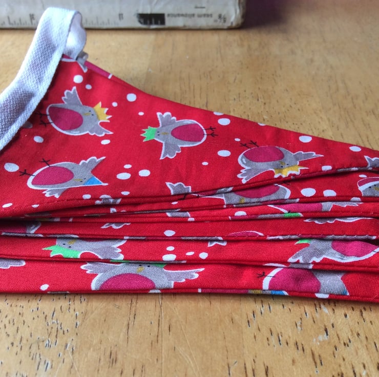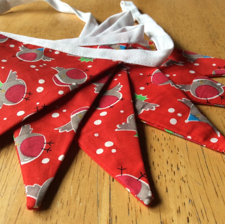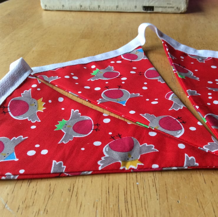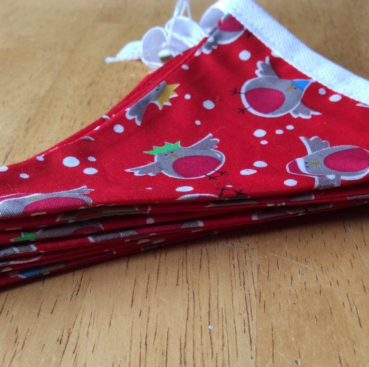 Christmas Robins Bunting, handmade in a bright red fabric with jolly robins having a Christmas party