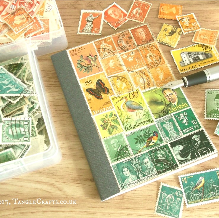 The cover-collage of postage stamps is individually arranged & glued into place with an acid-free, xylene-free adhesive then coated with a matt sealant for extra protection. The stamps still bear fragments of postmarks and other cancellation marks as a testament to their former active service with postal services around the world - a fascinating slice of history!