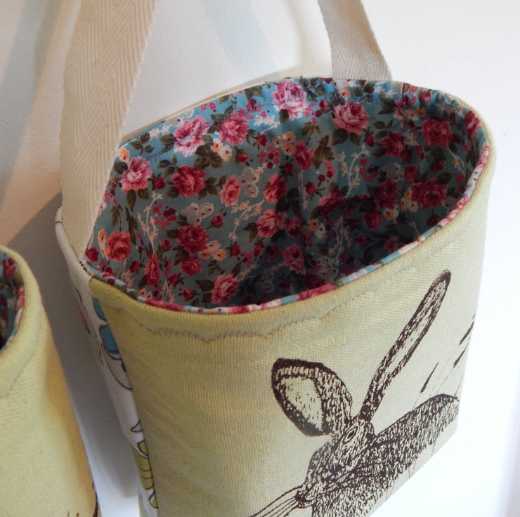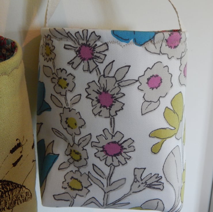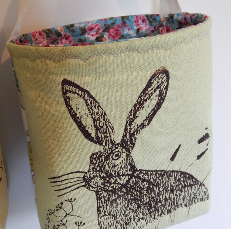 This is a lovely light green storage basket with a brown hare with wild grasses, screen printed on to it. The back of the basket has a pretty pink, blue and white large modern floral pattern. The basket has wadding and interfacing to give a good strength to it. The basket is lined with a small pink rose pattern on blue material. There is a hanging strap on the back which makes it ideal for popping onto a door or furniture handle. The storage basket does also sit nicely on its base which makes it perfect for sitting on a desk or set of drawers.