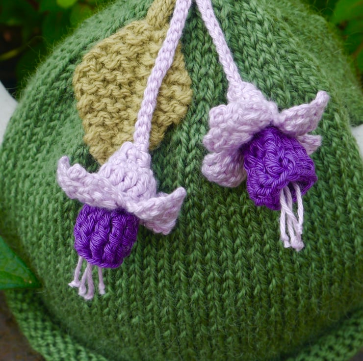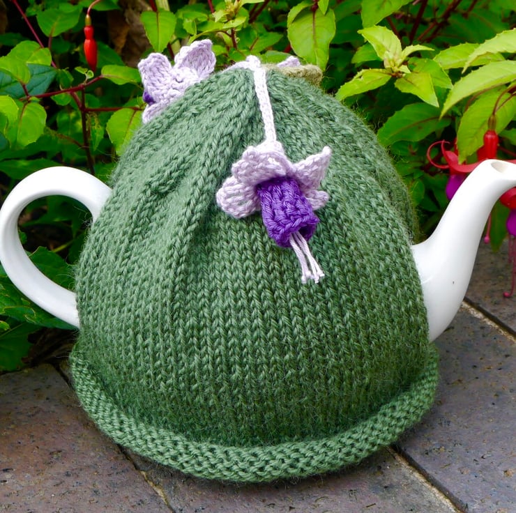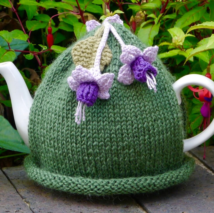 Fuchsias are one of my favourite flowers and I have made a pretty tea cosy with these flowers attached. There are two fuchsias on the front and one on the back and they are crocheted using purple and lilac cotton. There is a green knitted leaf on the front too. The tea cosy is hand knitted using a lovely warm aran yarn which will keep your tea nice and warm. It will fit a standard 4-6 cup teapot.