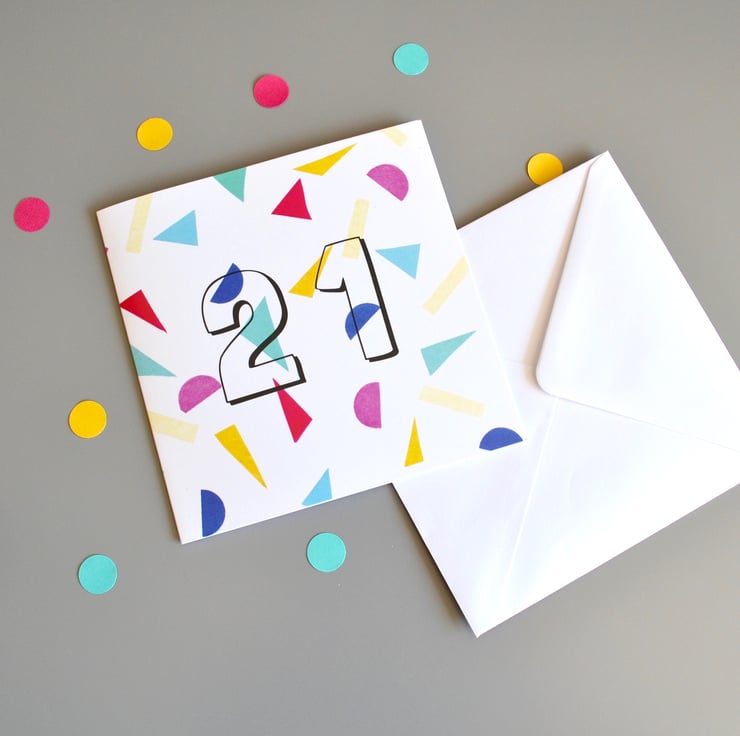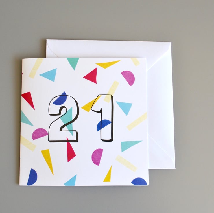 This 21st birthday card, which I designed to be suitable for men and women, has an appropriately celebratory feel with sprinkles of geometric shaped confetti in bright colours. The background is white and the all-important number, 21, in black outline, is in the middle of the card. The background confetti pattern was created by cutting and sticking multi coloured tissue paper in to triangles, semi circles and rectangles.