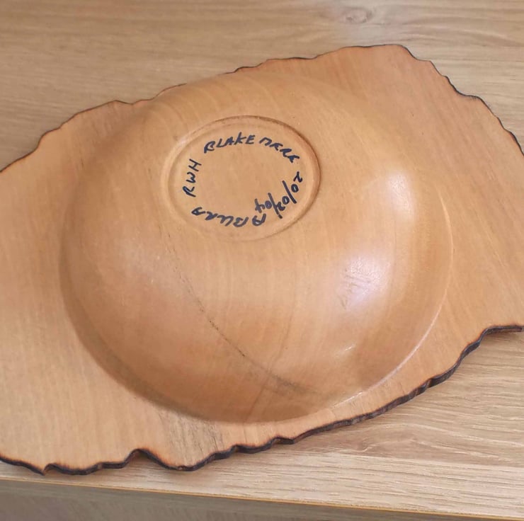 Turned from abura an African timber the edge has been shaped and burnt to give a dark effect