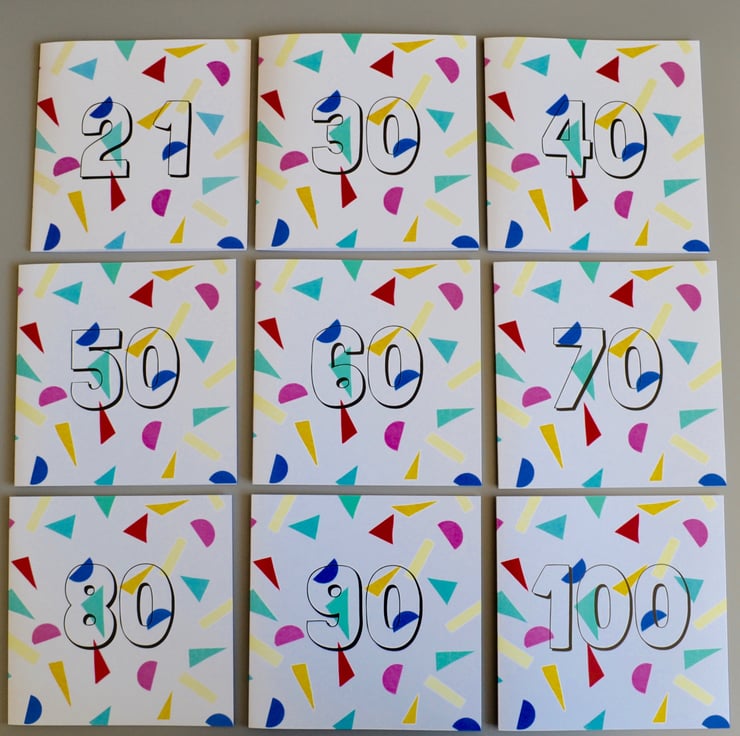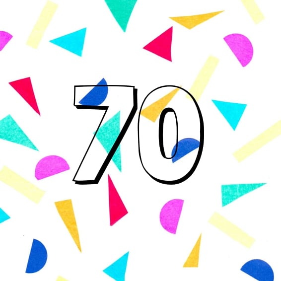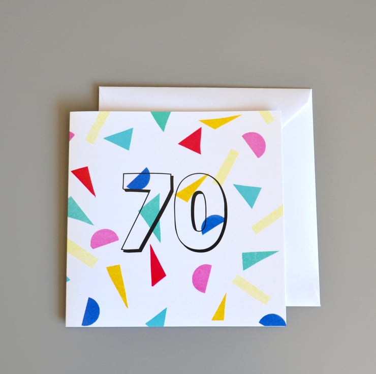 This 70th birthday card, which I designed to be suitable for men and women, has an appropriately celebratory feel with sprinkles of geometric shaped confetti in bright colours. The background is white and the all-important number, 70, in black outline, is in the middle of the card. The background confetti pattern was created by cutting and sticking multi coloured tissue paper in to triangles, semi circles and rectangles.