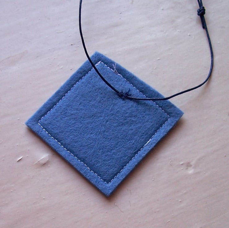 Wool felt backing, stitched onto dark blue waxed cotton cord with a slip knot fastening - this simply slips over the head and you then shorten it to your preferred length.