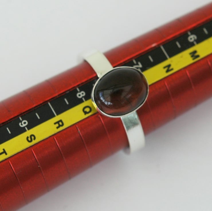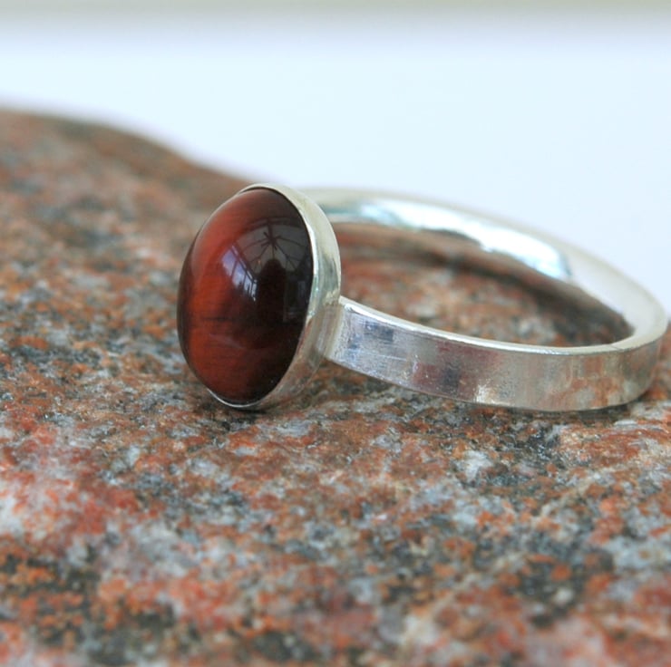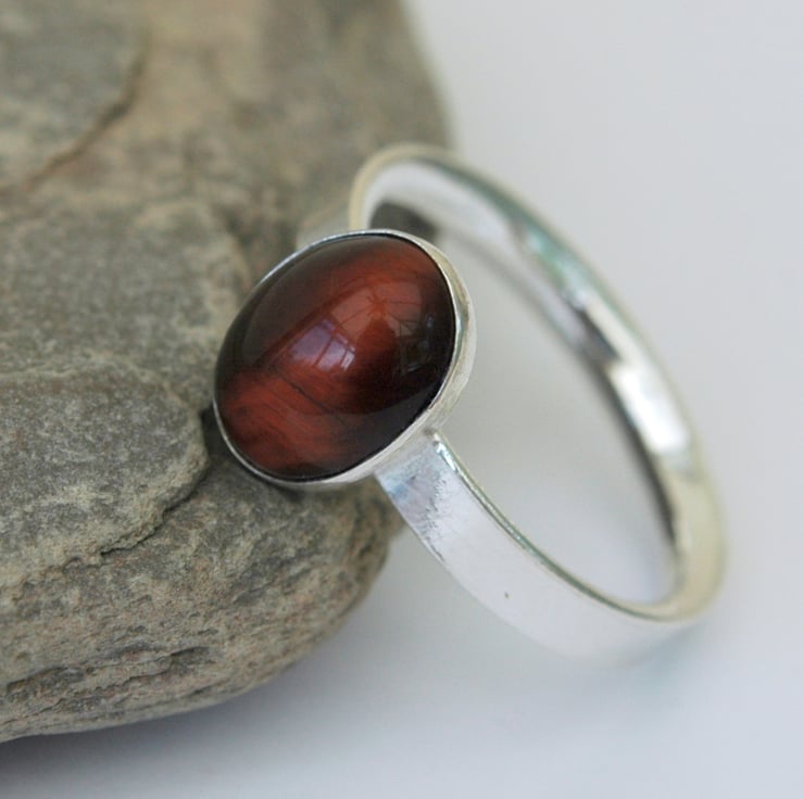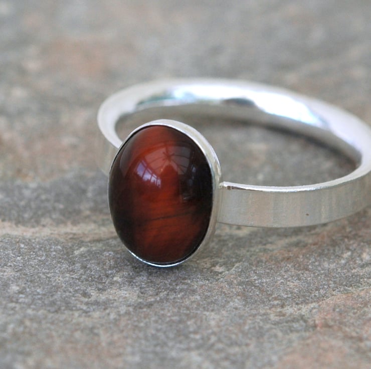 This beautiful sterling silver ring features one of my favourite gemstones - red tiger's eye. It is a lovely coppery red-brown colour with a deep shine and a pronounced Schiller effect - a band of reflected light that seems to shift as you move the ring around. This ring is available in size P. The cabochon is oval, 10x8mm, and set in a sterling silver bezel cup. The ring shaft is 3.2mm wide and has a D-shaped profile with the curve on the inside, making it particularly comfortable and easy to put on and take off. Traditional silver hallmarks including my own maker's mark have been applied by the London Assay Office.