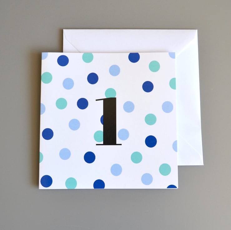 Kid's age birthday card with a dotty pattern in navy, light blue and aqua on a crisp white background. Age in black text in the centre of the card.