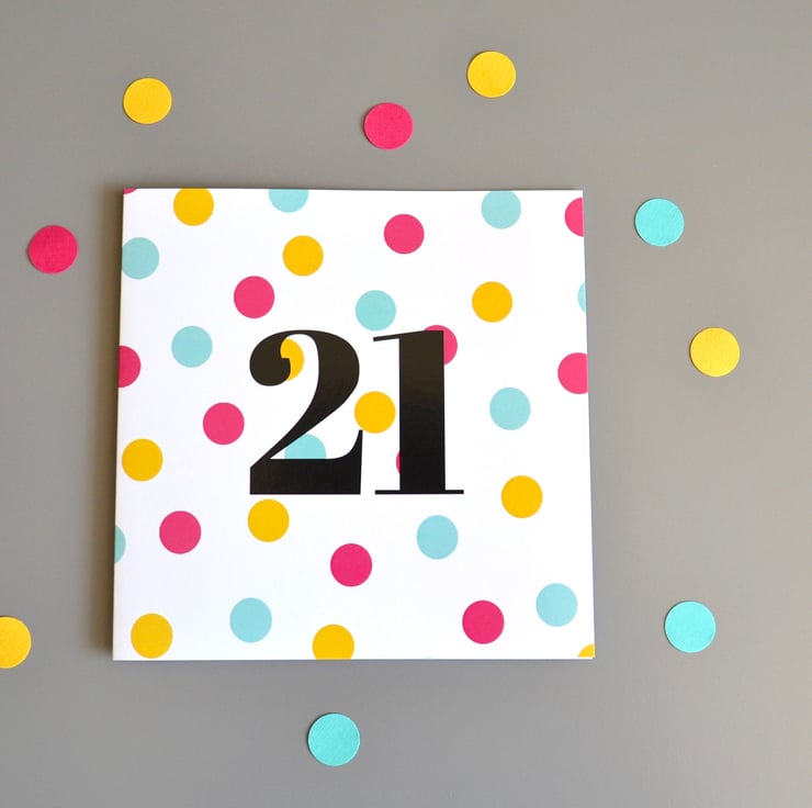 Birthday cards made for those significant ages worth a special mention! With a dotty celebratory-feeling pattern in bright pink, deep yellow and aqua on a crisp white background. The age is in black text in the centre of the card.