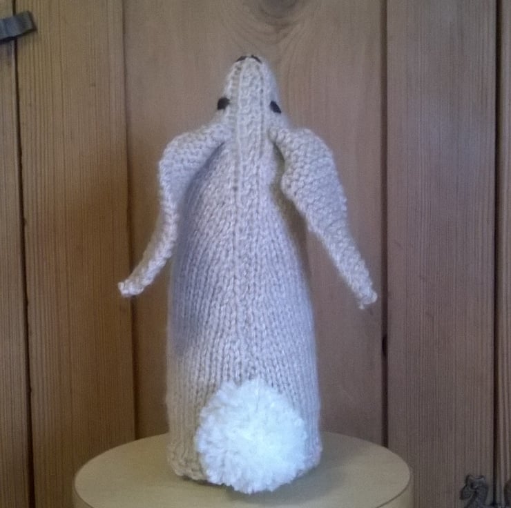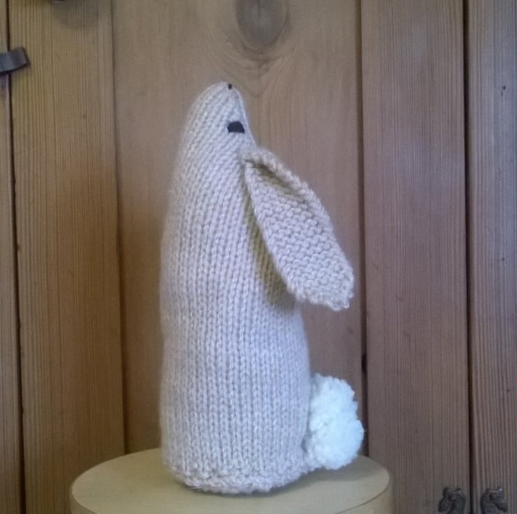 A moon gazing hare, hand knitted in the most scrumptious vanilla fudge coloured yarn, boasting the longest ears ever and the fluffiest cream coloured tail.