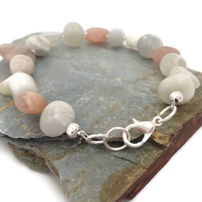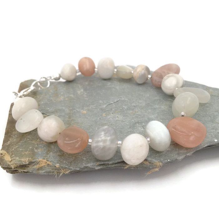 Made using centre drilled and multi-colour drop style Moonstone nuggets that are approximately 9x7mm to 13x10mm in size, with silver lined crystal seed beads in between each one. Each of the nuggets look like pebbles, giving this bracelet a very natural feel.