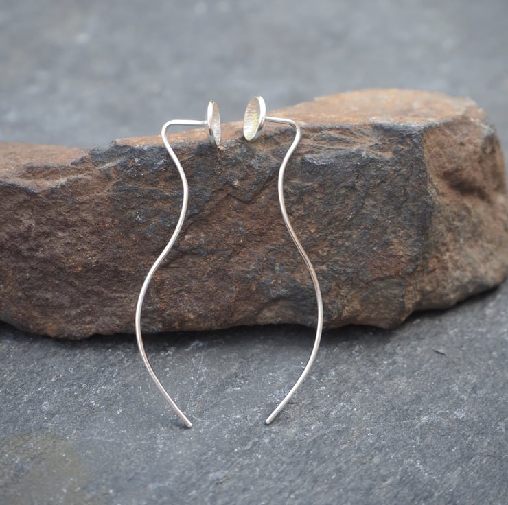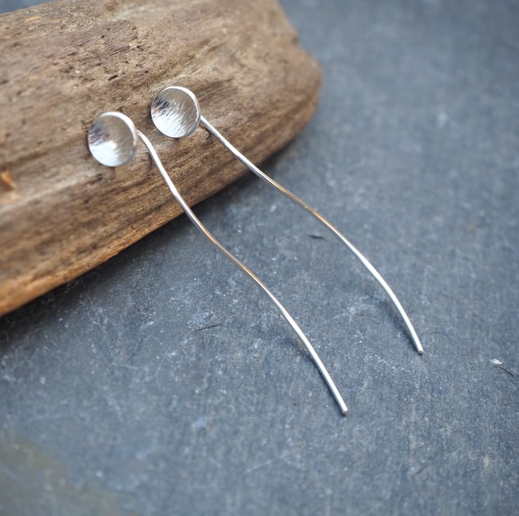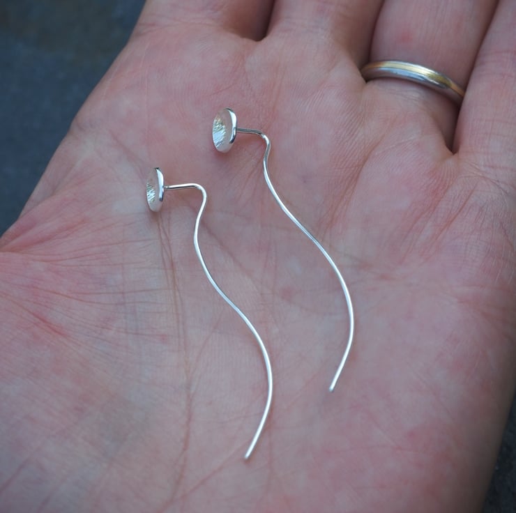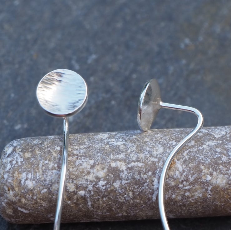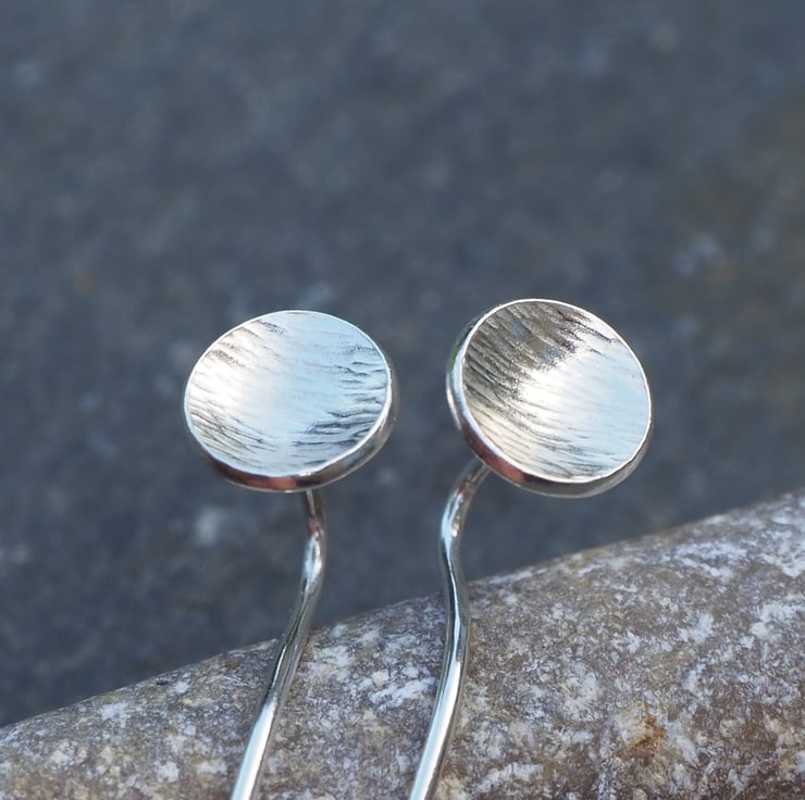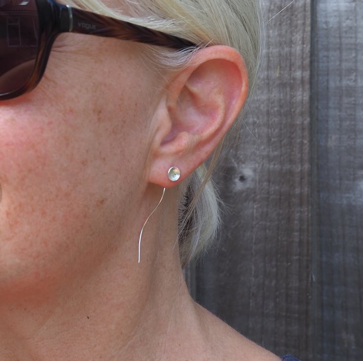 These contemporary earrings are based on a simple stud earring but instead of having a scroll back they have an extended ear wire that hangs down the back so that they stay in place without the need for an earring back.