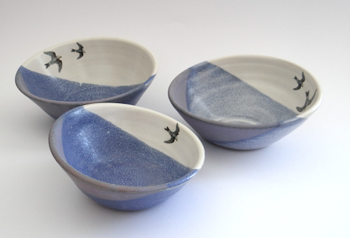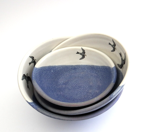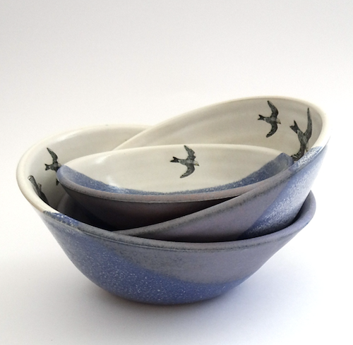 This is an unusual and eye-catching set of three bowls, thrown on my wheel and altered at the leatherhard stage to create gently sloping rims. They are functional - inviting use on the dining table - whilst being distinctly decorative thanks to their contouurs, soft shades of glazes and those lovely images of swifts produced by my illustrator daughter Zanna - zannaallenillustration. co.uk - flying as if through the air from one bowl to the next.