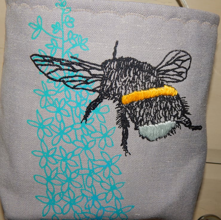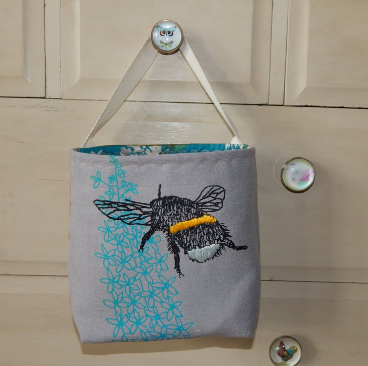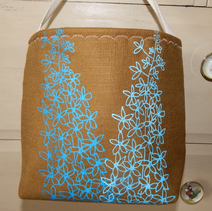 This is a lovely storage basket that is screen printed with my bee and delphinium design. The ink is blue for the delphinium and black for the bee, printed onto grey cotton/linen. The basket is lined with a gorgeous blue blossom design. The back of the basket is a brown material with 2 delphinium flower stalks screen printed onto it. The bee on the front has hand embroidered yellow and white bands. Each basket has a handle for hanging from door knobs, bed frames etc but the basket also sits flatly for desk or drawer tops. The basket is lined with wadding and interfacing to give a nice strength.