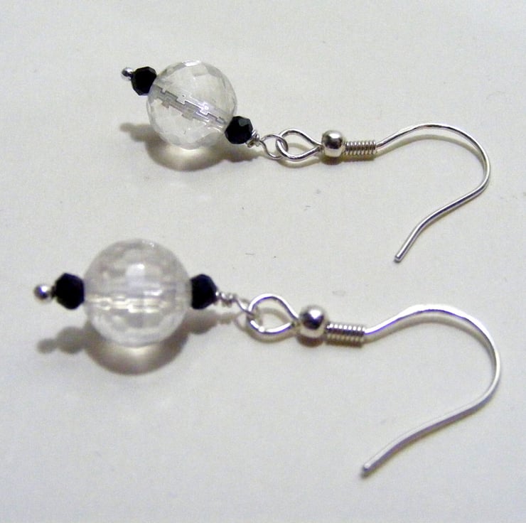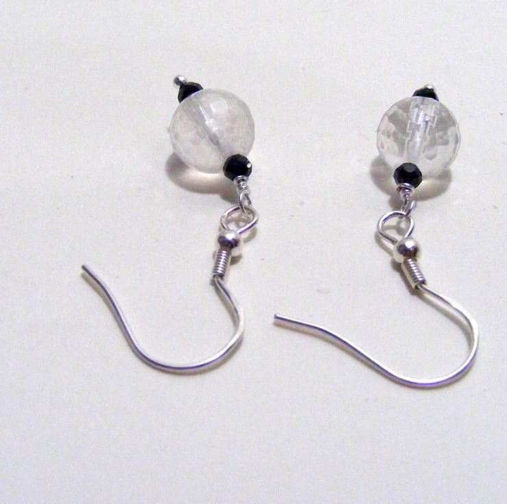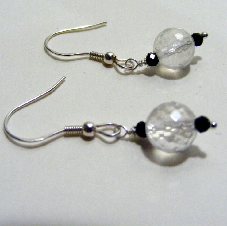 I have made this pair of semi precious gemstone earrings using 8 mm clear quartz faceted round beads and 2 mm black faceted spinel rondelles. Ball headpins and ear wires are 925 sterling silver. 925 is stamped on the ear wires.