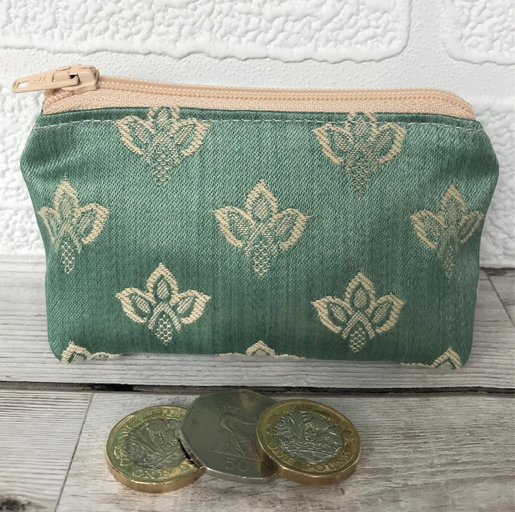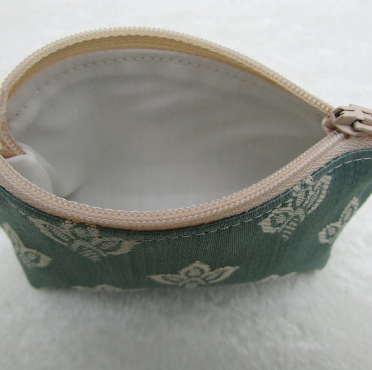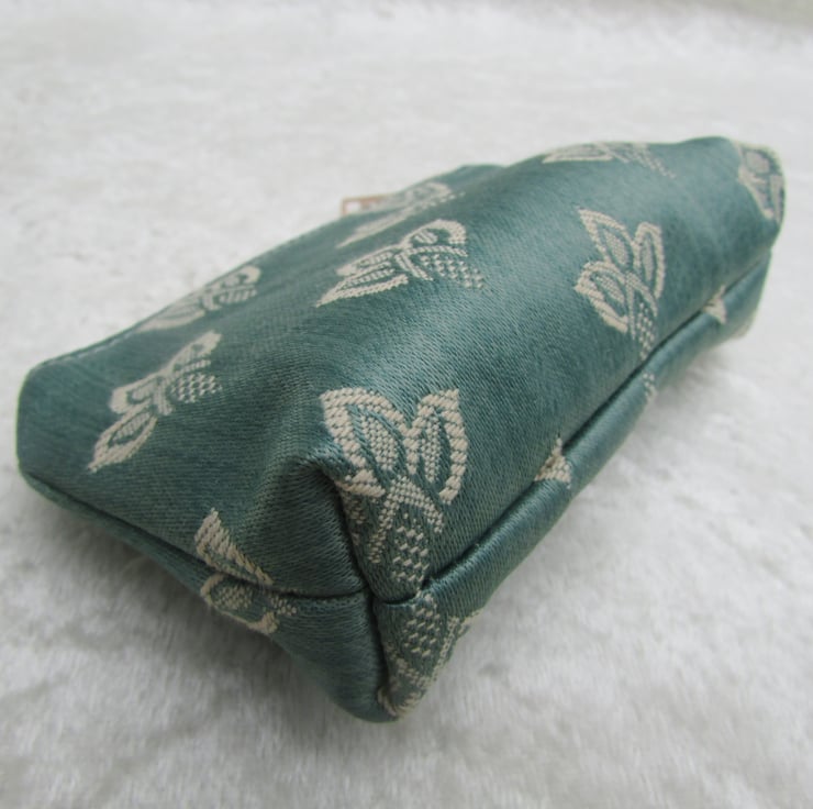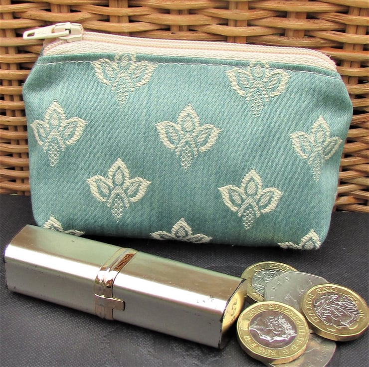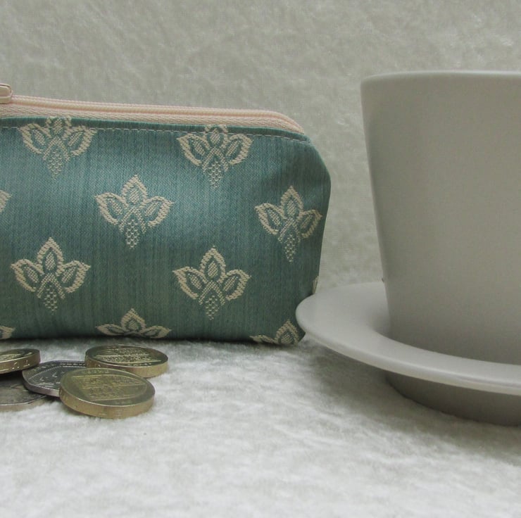 A cute small purse in a luxurious duck-egg blue fabric with a lovely sheen and a woven pattern in cream. The purse has a matching cream zip and is lined with cream fabric. The base of the purse is boxed to give extra room inside.