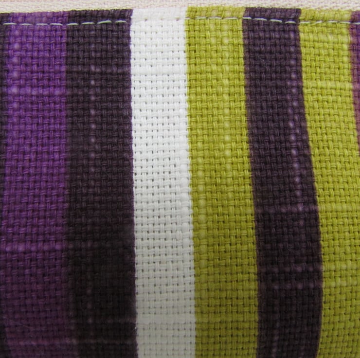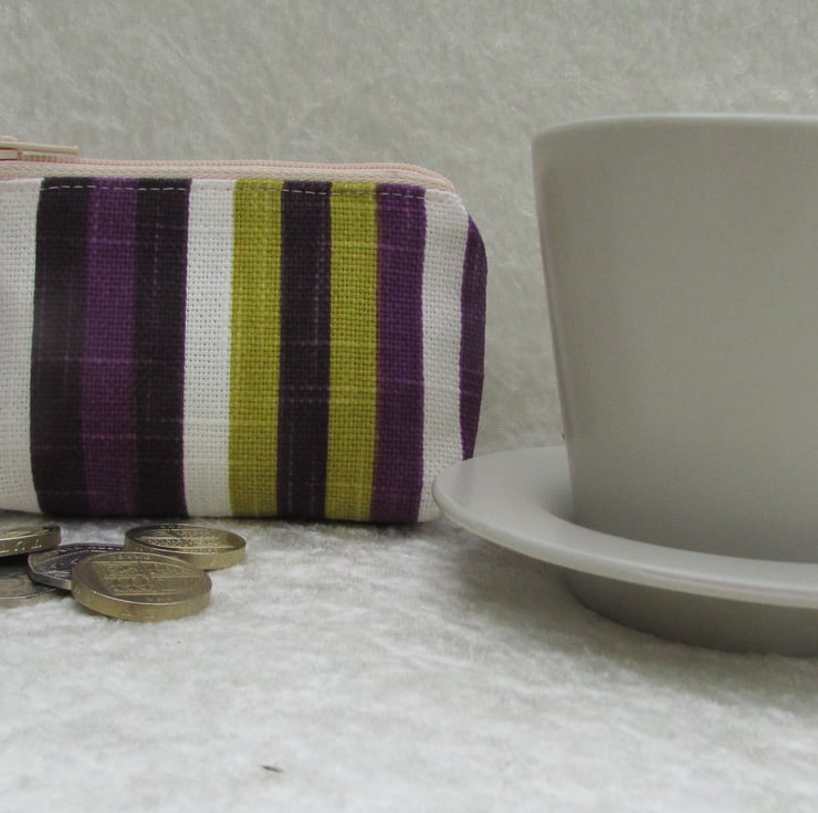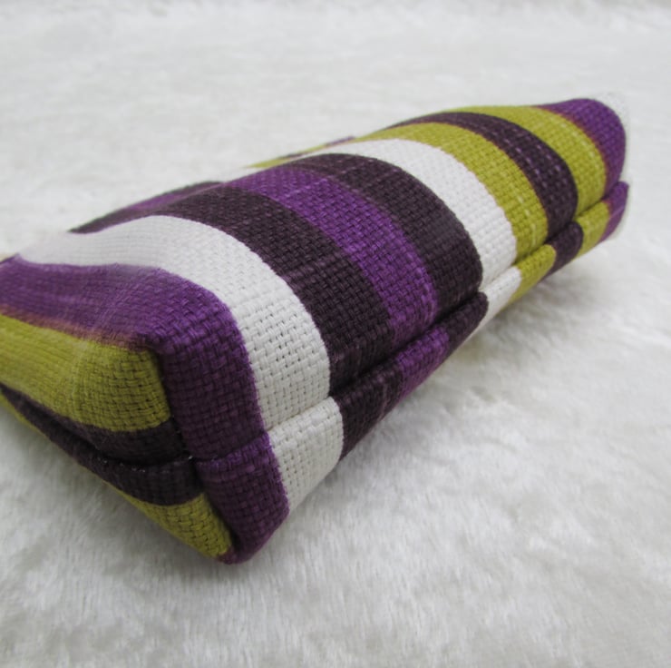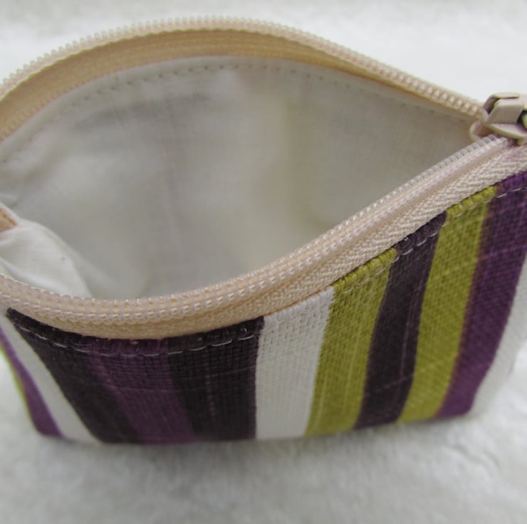 A small purse in striped fabric in a striking colour combination of purple, dark purple, lime green and white. The purse has a zip fastening and is lined with cream fabric. The base of the purse is boxed to give more space inside.