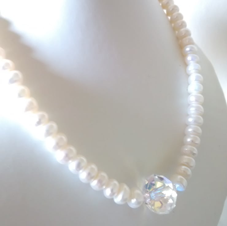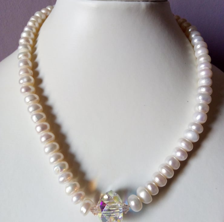 THIS NECKLACE IS HANDMADE WITH WHITE FRESHWATER CULTURED RONDELLE PEARLS EACH MEASURING APPROX 8X5 MM AND A 16MM SWAROVSKI CRYSTAL WITH TWO SMALL CRYSTAL ON EACH SIDE.