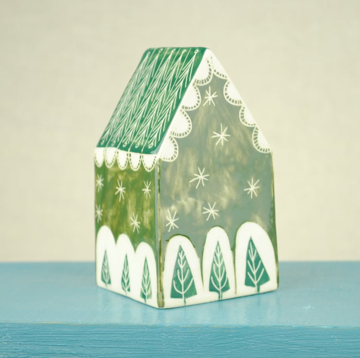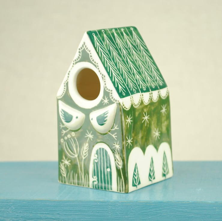 This house is hand built from white earthenware clay, decorated with coloured slip and finished with a hand drawn design using the scraffito technique.