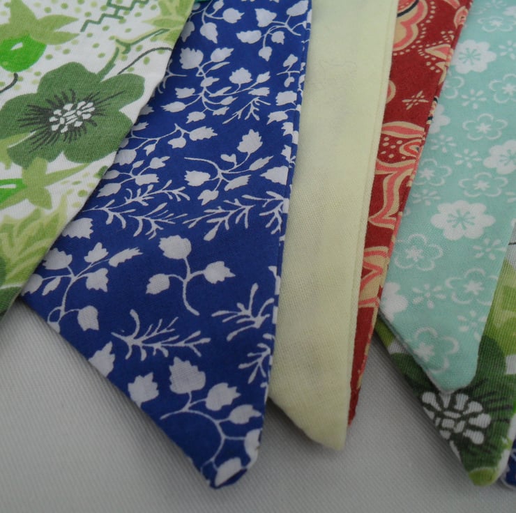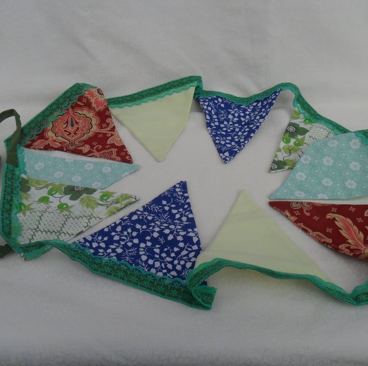 The majority of the ten flags are made from patterned fabric expect of the very light yellow/green flags which are plain in colour. There are two different shades of blue both with a different pattern of small white flowers. There are bold green and white large floral flags/pendants. Some of the flags/pendants are created from a rust and pink paisley inspired fabric.