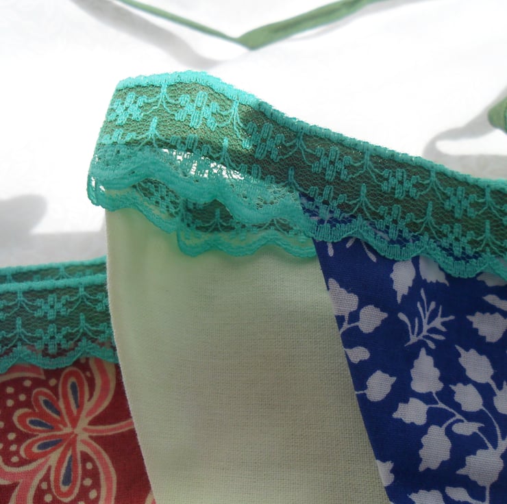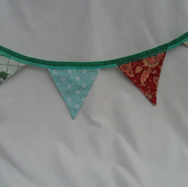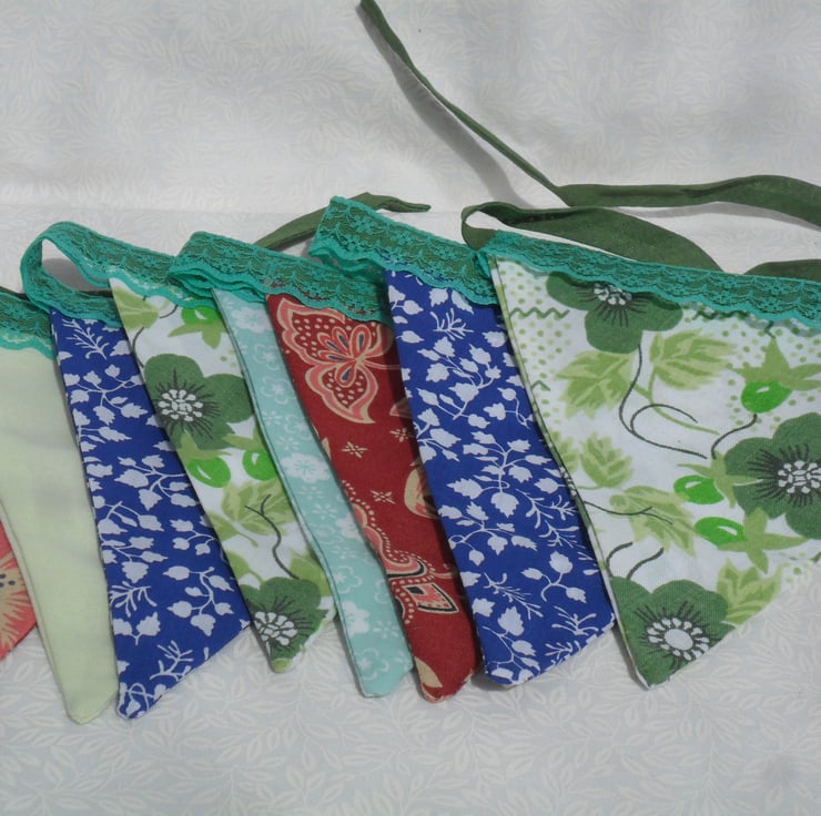 A length of vintage fabric bunting with green nylon lace trim. This very pretty length of bunting has been created using different vintage cotton/polyester fabrics. The fabric come from the period of the late 70's to the early 90's.