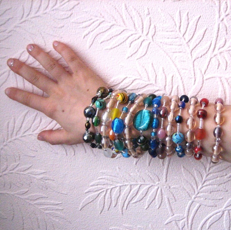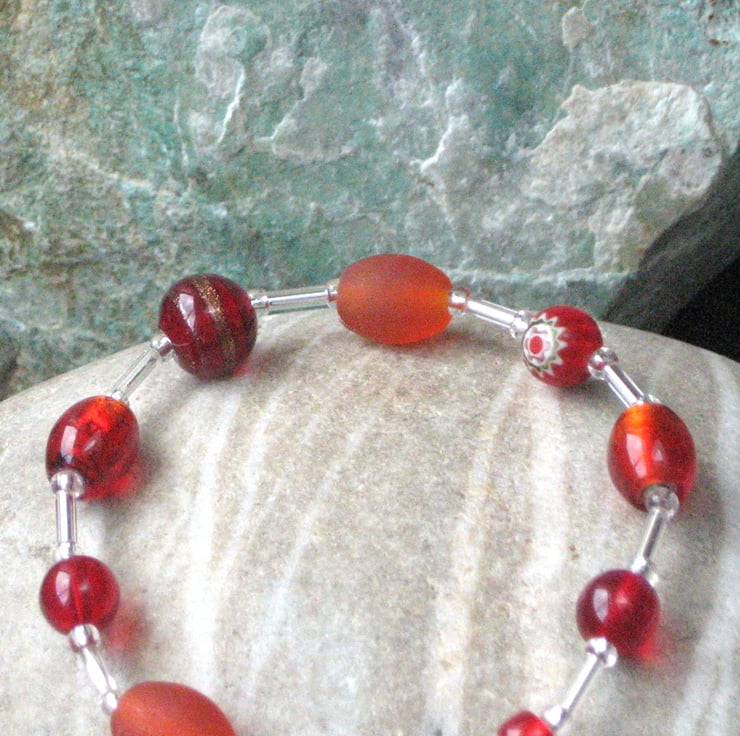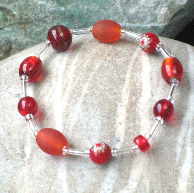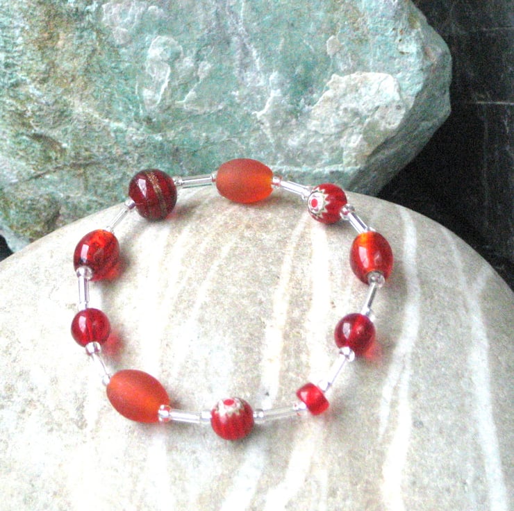 Red glass bead stretch bracelet. This striking bracelet has been made up using a variety of red and frosted burnt orange beads joined together with silvered glass tube and seed beads. Threaded onto elastic for everyday use, this lovely bracelet is perfect to add and accent of red to an outfit. A bracelet makes a great little gift for a friend for any occasion. To fit a small or medium adult wrist. Comes in an organza pouch.