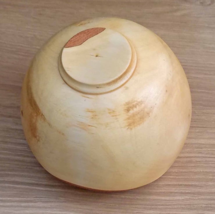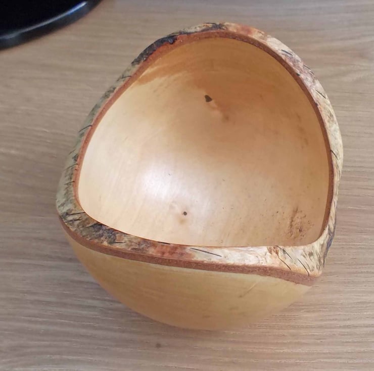 Turned from birch the outer edge of the bowl is the natural bark of the tree 4 inches diameter and 3.5 inches high. Finished with Danish oil