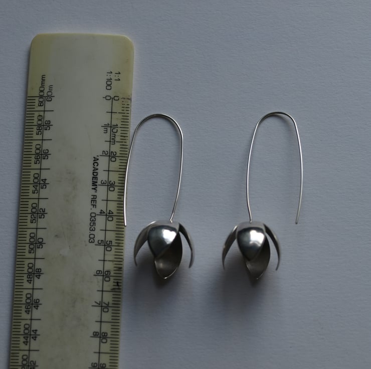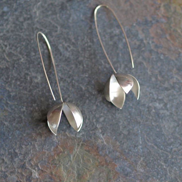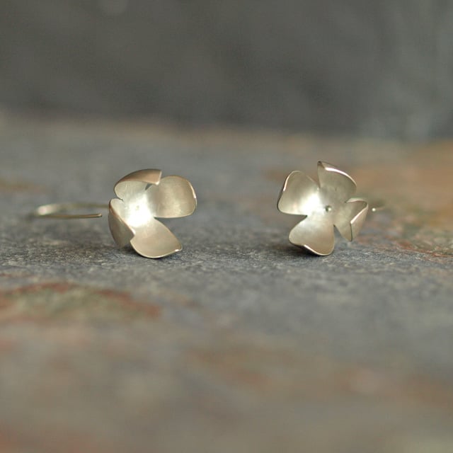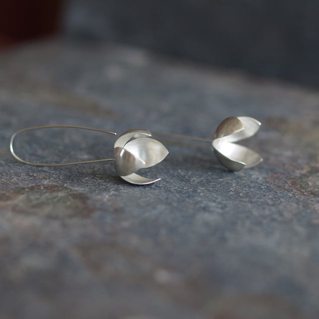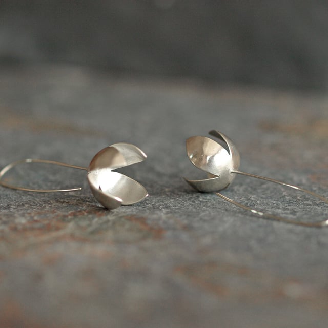 These delightful threader earrings have been handmade in recycled silver. The petals have been hand-sawn and curved into a more natural petal form and have been soldered to curved recycled sterling silver wire to form the threader earring hooks.
