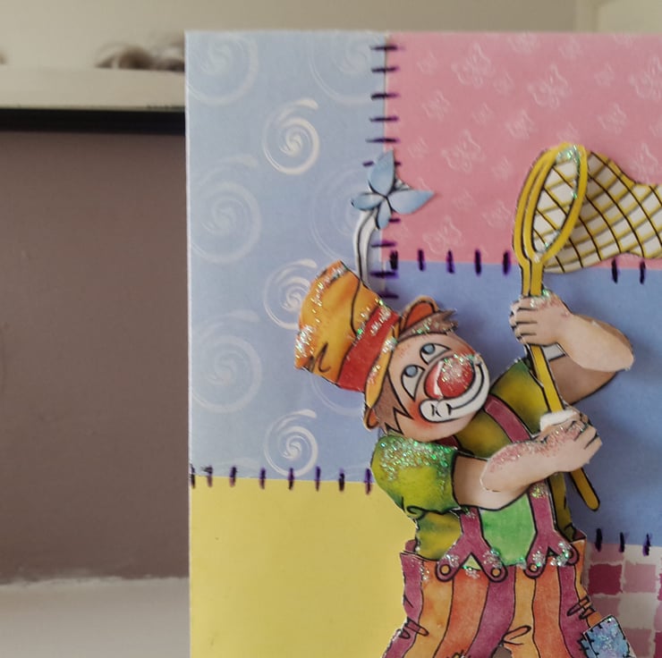 A completely hand and uniquely designed card. Consisting of a fun Clown which is decoupaged and with glitter highlights. Mounted onto a patchwork of different coloured papers with hand drawn stitches in black ink. Finished off with handwritten happy birthday in black ink. All mounted onto pristine white quality card