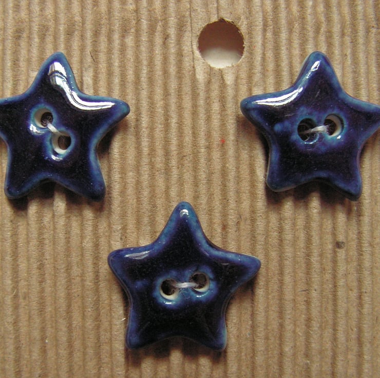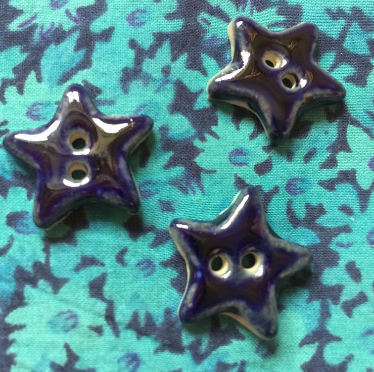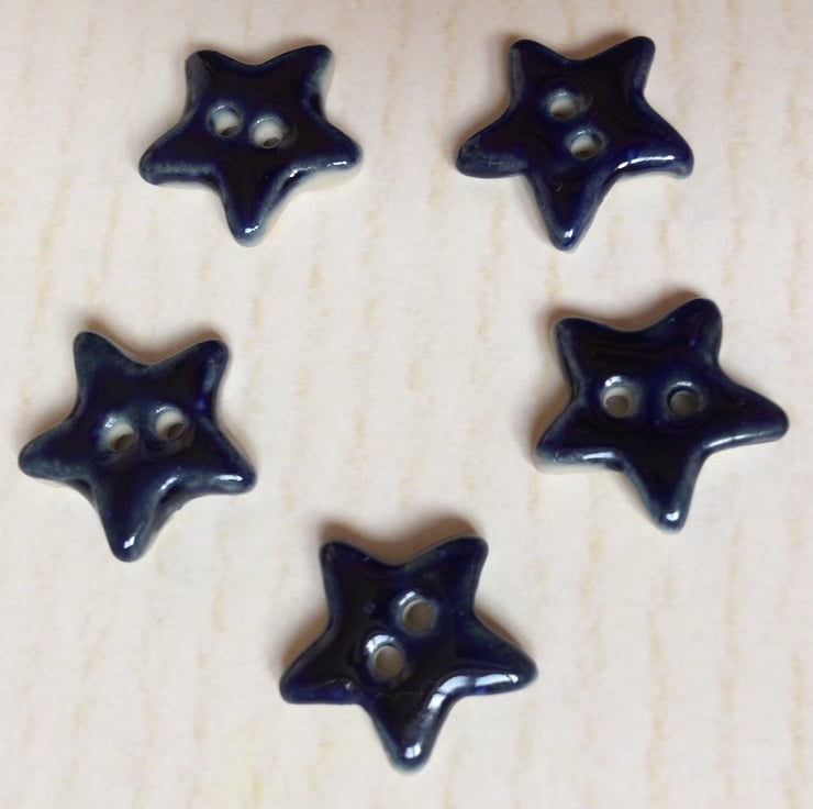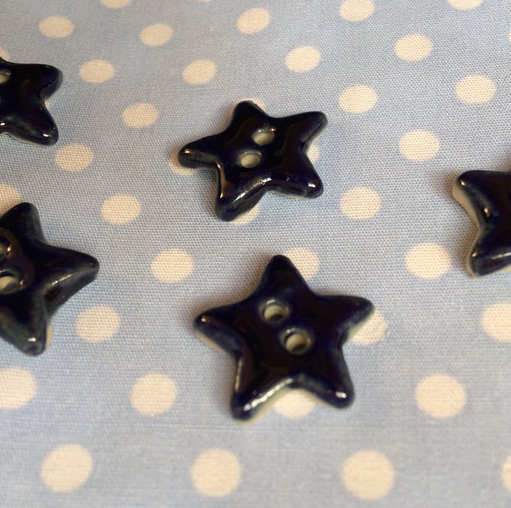 This lovely set of 5 small ceramic dark blue star shaped buttons feature a smooth gloss effect. They are handmade by Incomparable buttons in South Africa. The company provide a fair wage and good working conditions to help South African women support their families, as well as using environmentally friendly processing techniques and materials.
