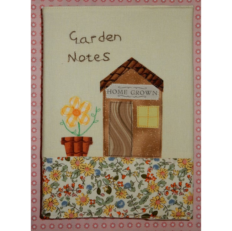 This is an A5 (approx. 9 x6 inches) notebook, with good quality lined paper, it has been covered with two fabrics, one a pretty floral and the other a plain linen mixed fabric. A garden shed and a plant have been appliqued on the plain fabric and the words "Garden Notes" have been added.