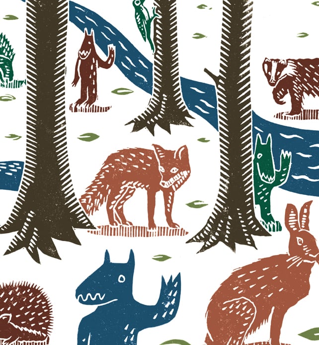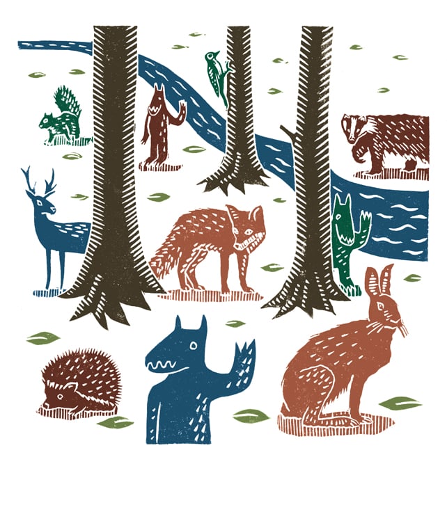 I was partly inspired by the event for which the print was created, a music festival in the beautiful setting on Endcliffe Park, Sheffield, and partly also by the idea of these unspecified 'creatures' just hanging out with some more typical forest wildlife!