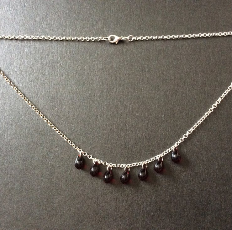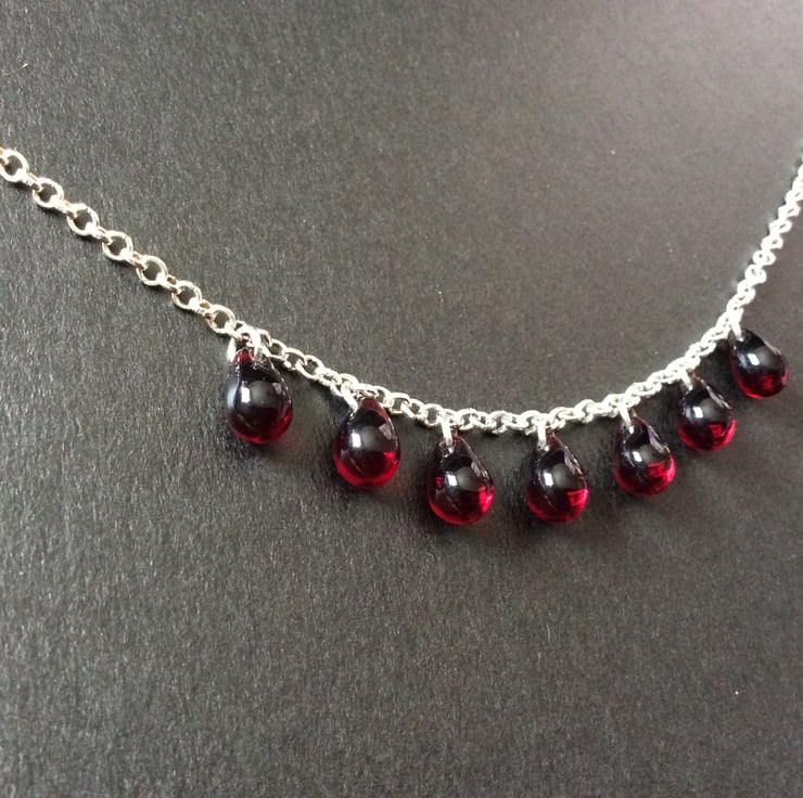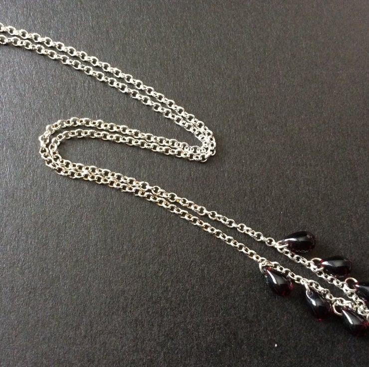 A gorgeous 18 inch silver plated rolo chain necklace, with 5 blood red garnet coloured teardrop Czech glass beads. These beads are so deep red, they look almost black.