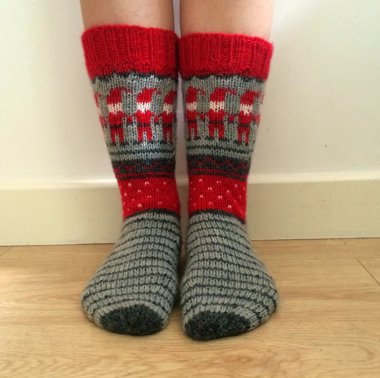 A pair of festive socks with Christmas elf pattern in red, dark and light grey colours.