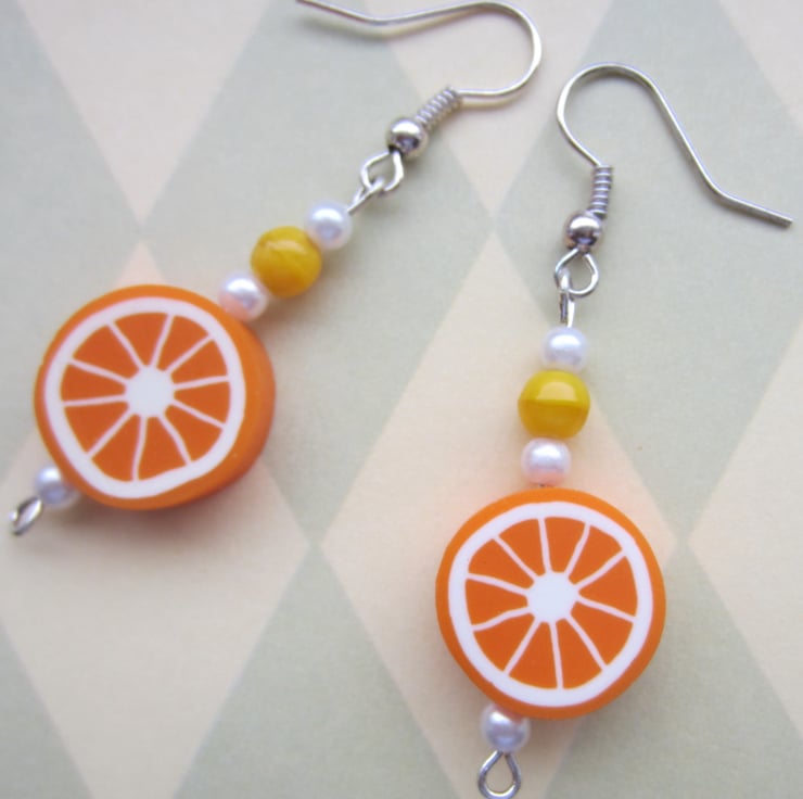 Quirky, fun earrings made with plastic orange slice beads and yellow and pearly white beads on silver plated ear wires.