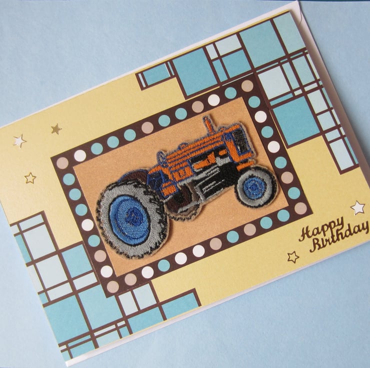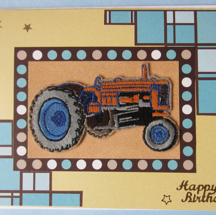 Birthday card made from a machine embroidered tractor mounted on card with a blue dot surround and decorated with blue check corners and stars.