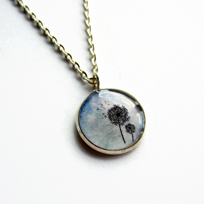 This pretty little pendant necklace features a picture of dreamy, floaty dandelion seed heads on a pale pastel lilac blue background.
