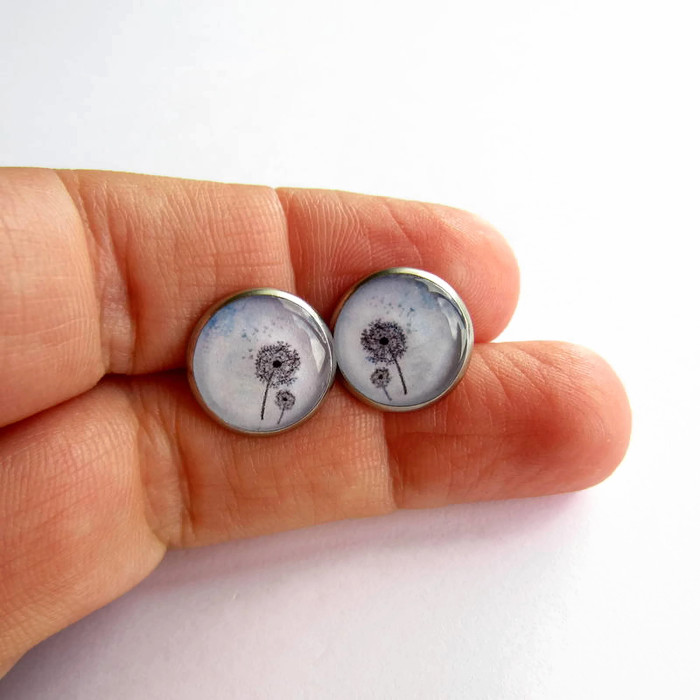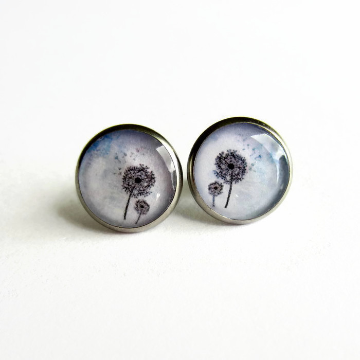 These pretty stud earrings feature a picture of some delicate dandelion seeds set against a pastel lilac blue background.