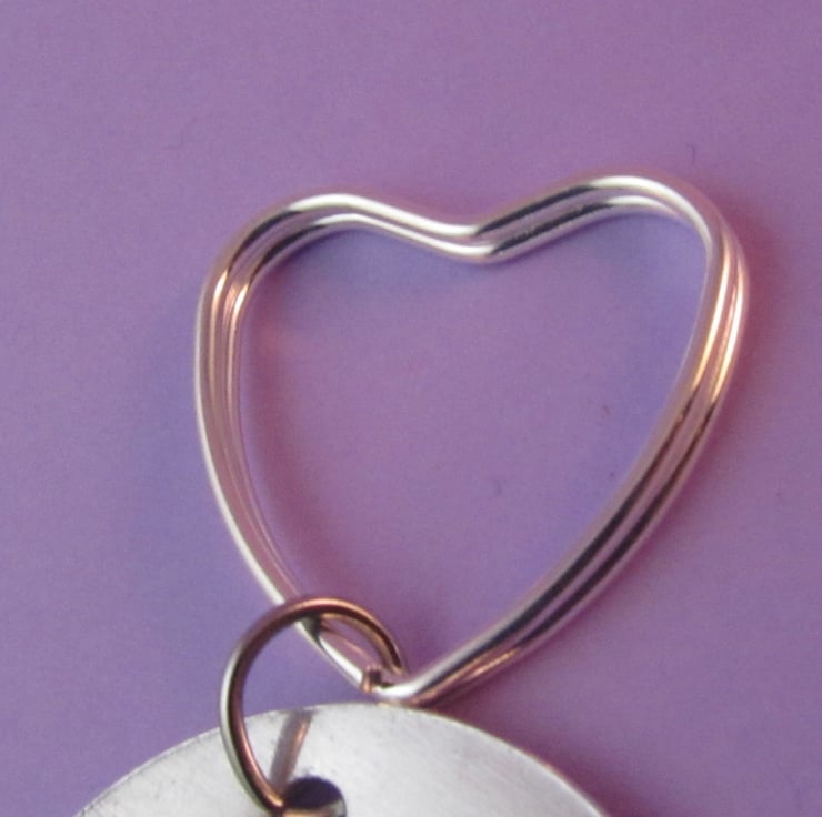 The aluminium is 3 cm (just over an inch) in diameter, and approx. 1 mm thick. The heart keyring is 2.1 cm tall and 2 cm wide.