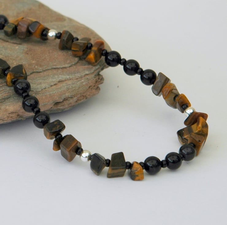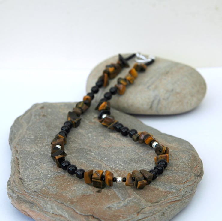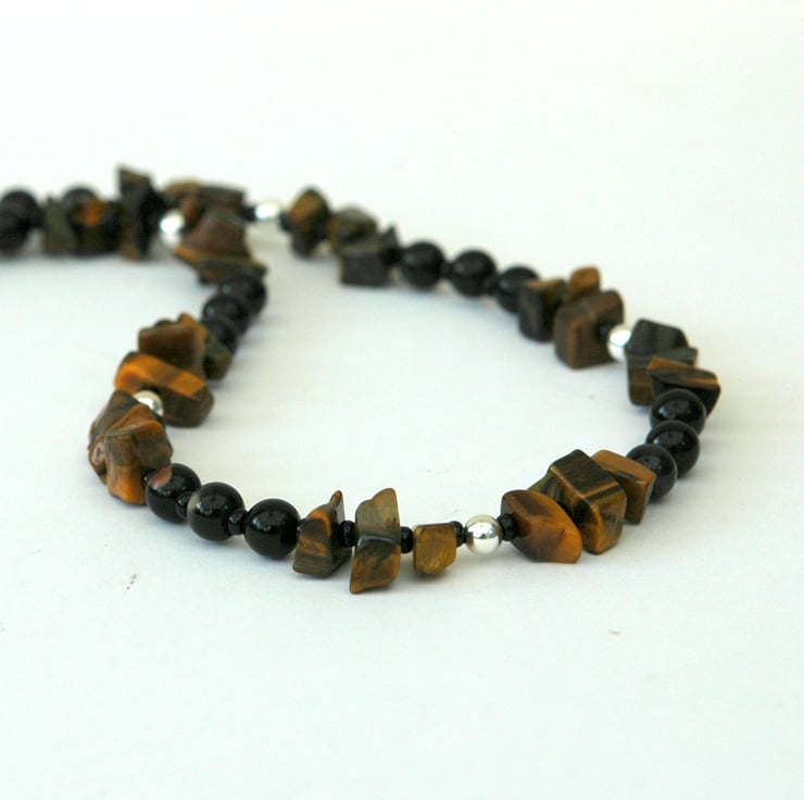 For this necklace I have combined sterling silver beads and clasp with irregular chips of golden tiger's eye and round beads of black agate. I like the variety of shapes and colours, with rich autumnal tones making it the perfect accessory for the coming season. The tiger's eye is striped in shades of caramel, golden brown and black. The agate beads are mainly black with hints of warm reddish brown. Black seed beads alternate with the larger beads and I have added sterling silver beads at intervals to bring in sunlight and sparkle. The sterling silver hook clasp and ring were handmade by me. This necklace will be packaged in a smart gift box and sent by Royal Mail first class post.