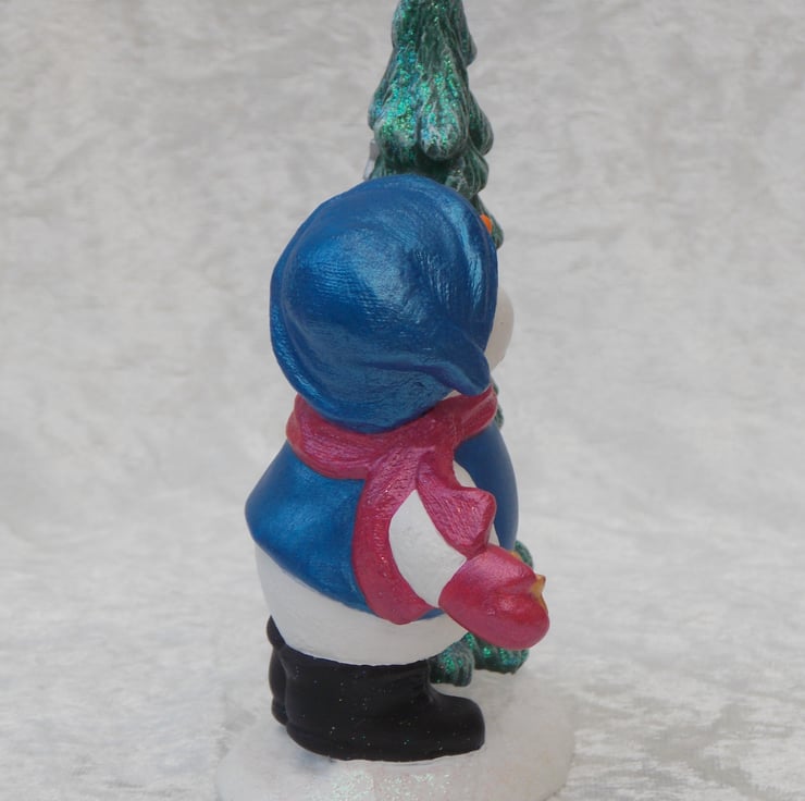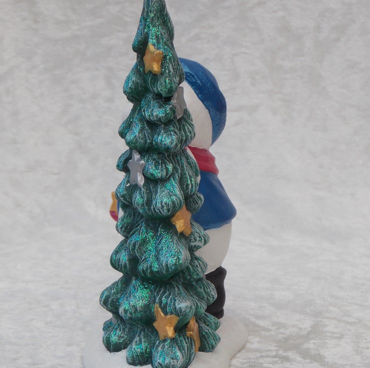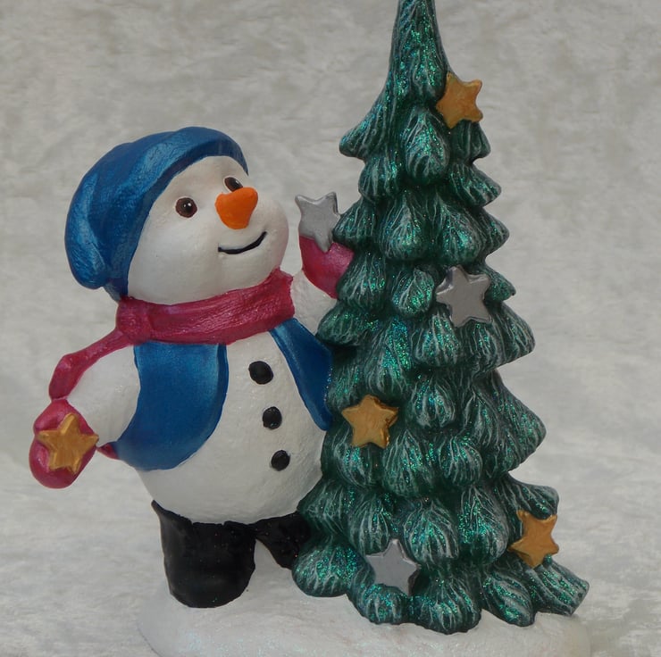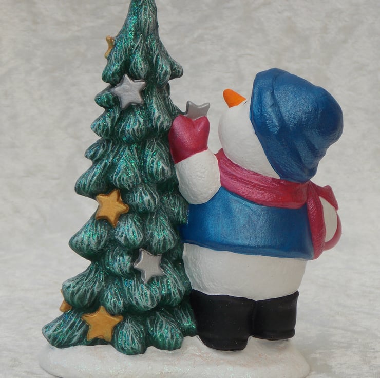 I have for sale a small ceramic Christmas ornament, which was hand painted by myself. It is a snowman dressed in a blue hat and waistcoat, with a red scarf and black boots. It is standing next to a green Christmas tree, decorated with gold and silver coloured stars, which it looks like the snowman has just decorated. The whole item has a lovely glittery effect all over it. This would make a lovely addition to anyone's Christmas decorations, or perhaps given as a gift.