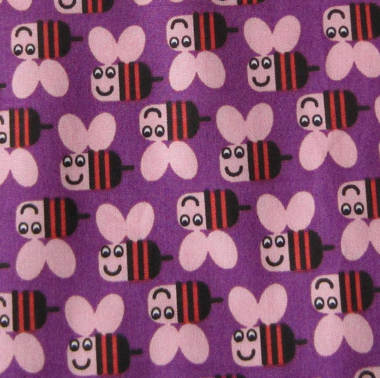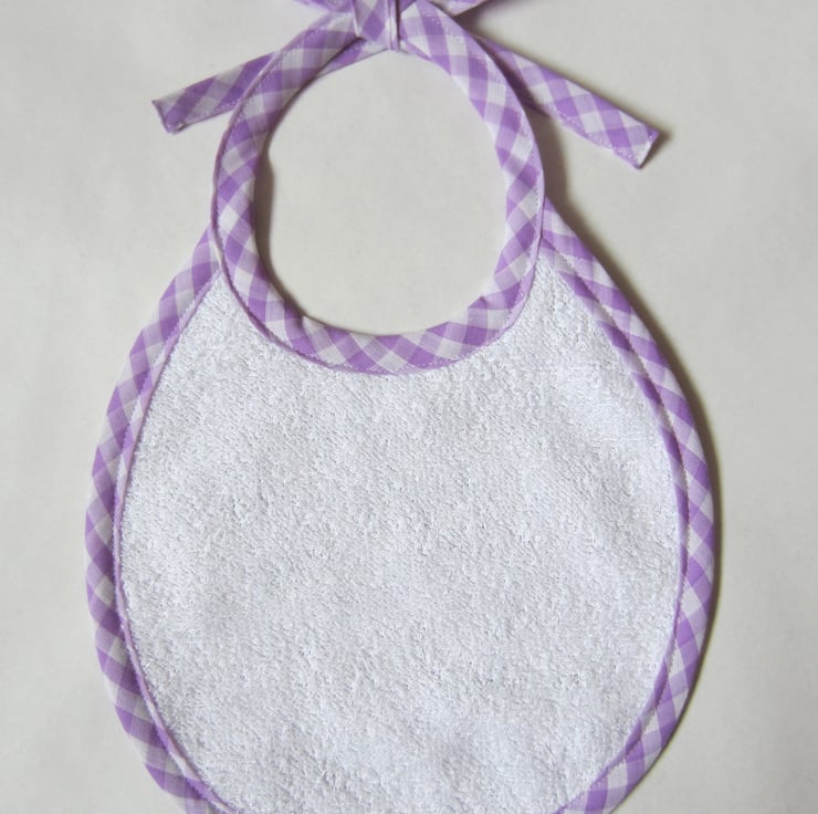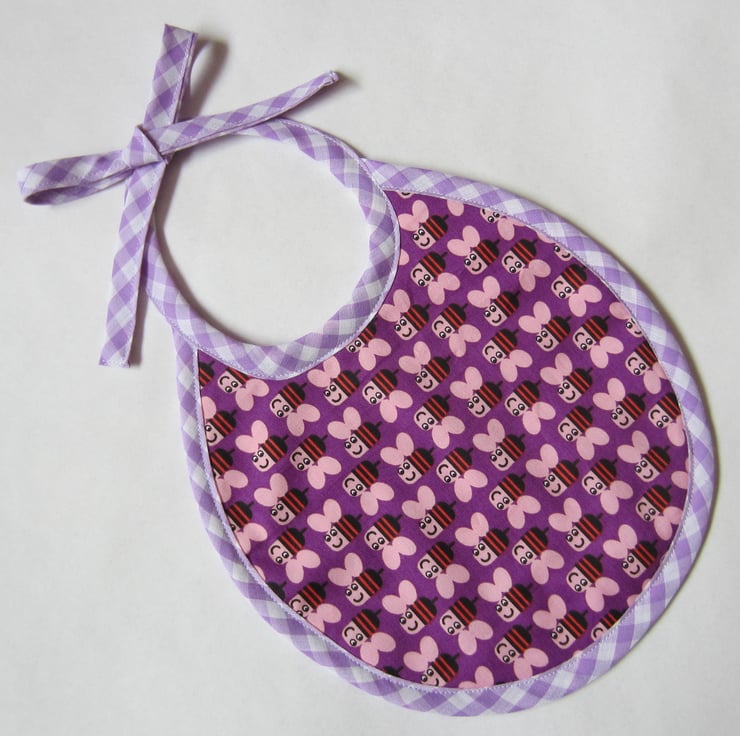 First size bib with pink, orange and black bees on a purple background. Edged in lilac and white gingham check and backed with white towelling. Suitable for a newborn to babies aged about 6 months. It measures 22 x 21 cm and fastens with a bow at the back of the neck for a good fit.