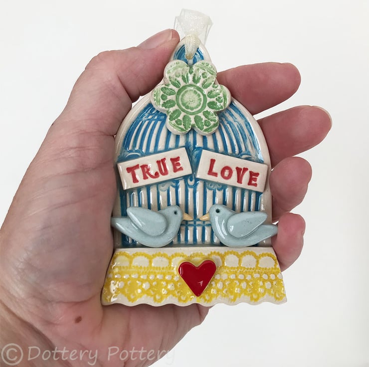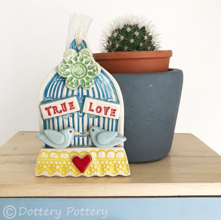 This little wall plaque is made from white earthenware clay, fired, glazed and then fired again. It measures 7cm x 10cm x 1.5cm deep. It has been stamped, embossed and finished with 2 cute lovebirds.