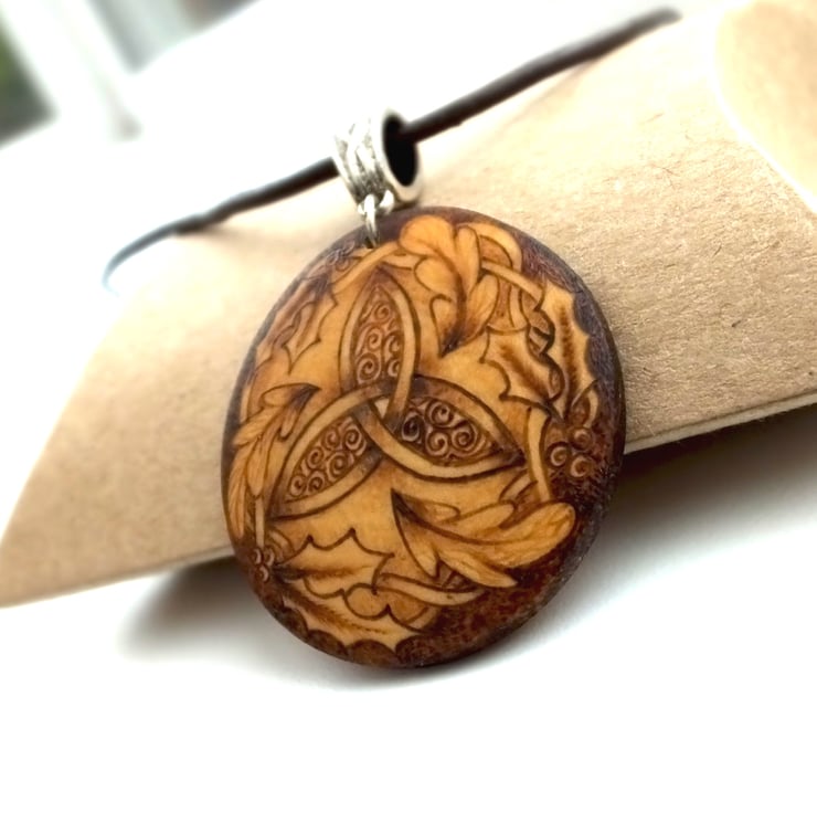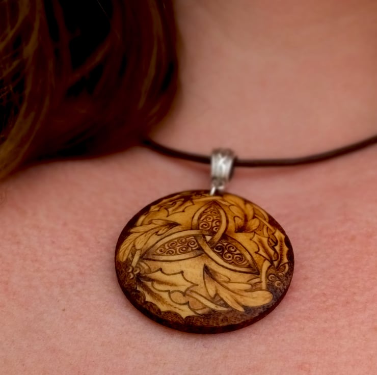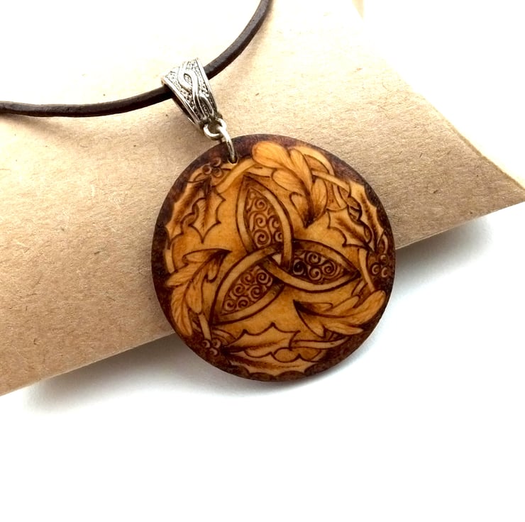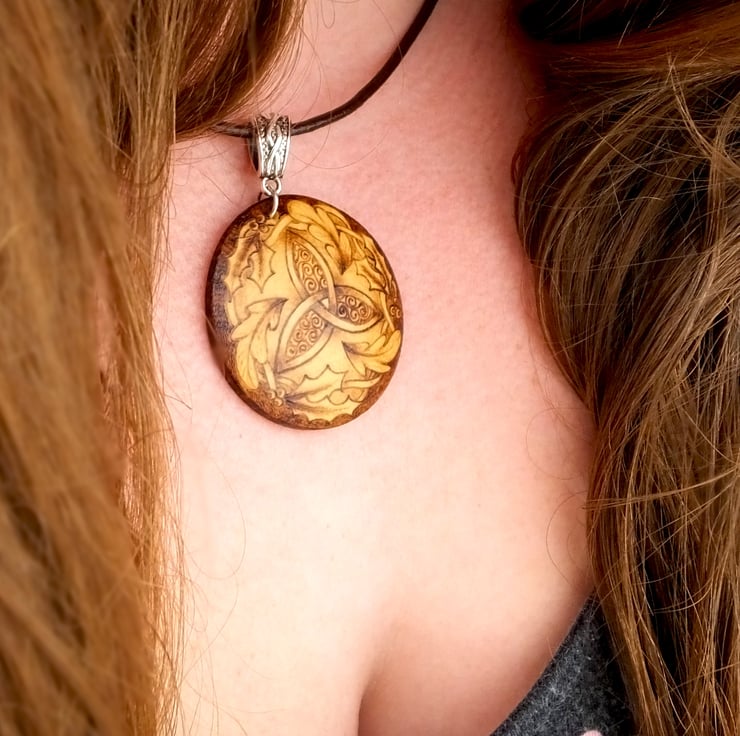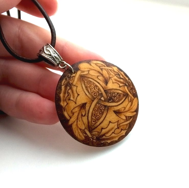 This listing is for a beautiful woodland triquetra themed circular domed wooden pendant decorated using pyrography...