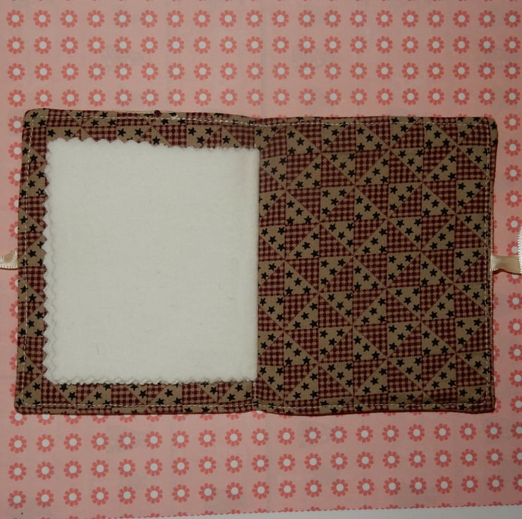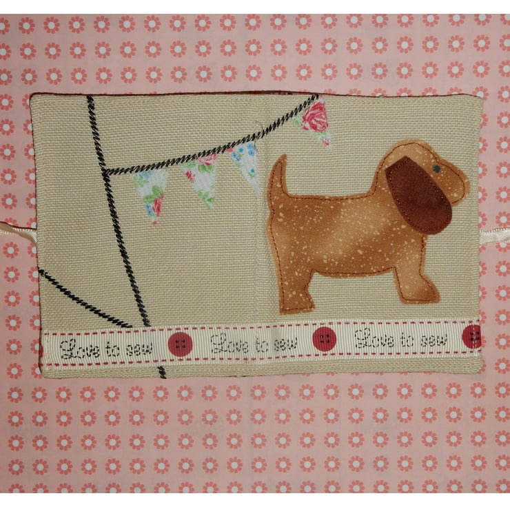 This needle case measures approx 4.5 x 3 inches and is made from a linen effect fabric, with a cute dog appliqued on, and floral bunting. It also has a ribbon reading "Love to sew". It is lined in toning cotton fabric and has four flannel leaves for your pins and needles. It is fastened with ribbon ties, which can be tied right round the case for protection in a bag.