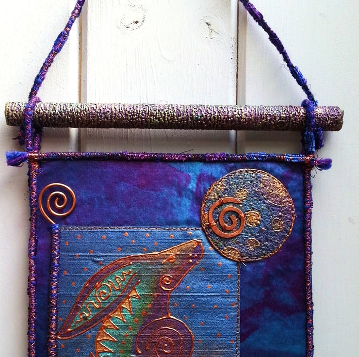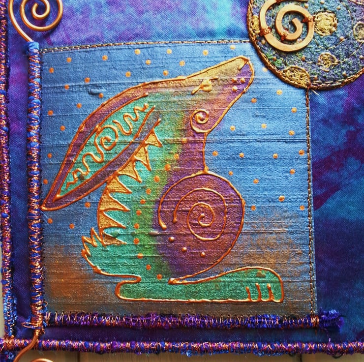 I love Hares and their symbolism and their connection to the moon and spring equinox. I represent them here gazing at the moon,in the night sky among the stars. Most of my hares also include at least one spiral or a heart or both. Symbols of the core of our being and love of life.
