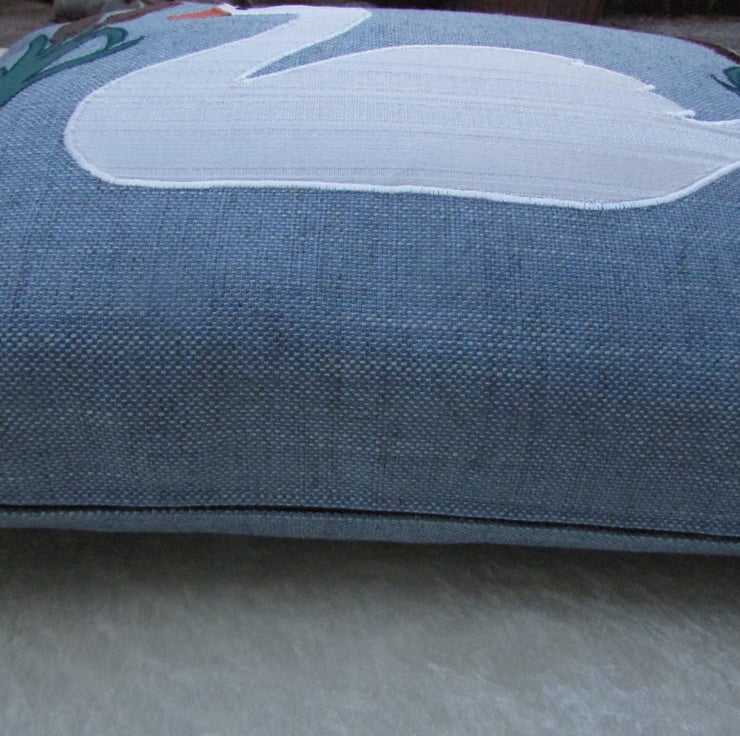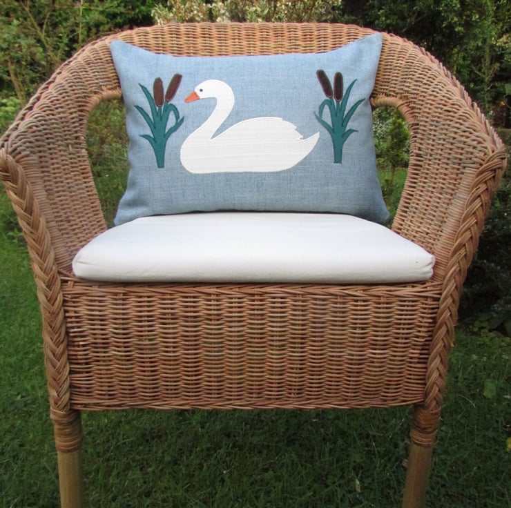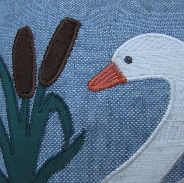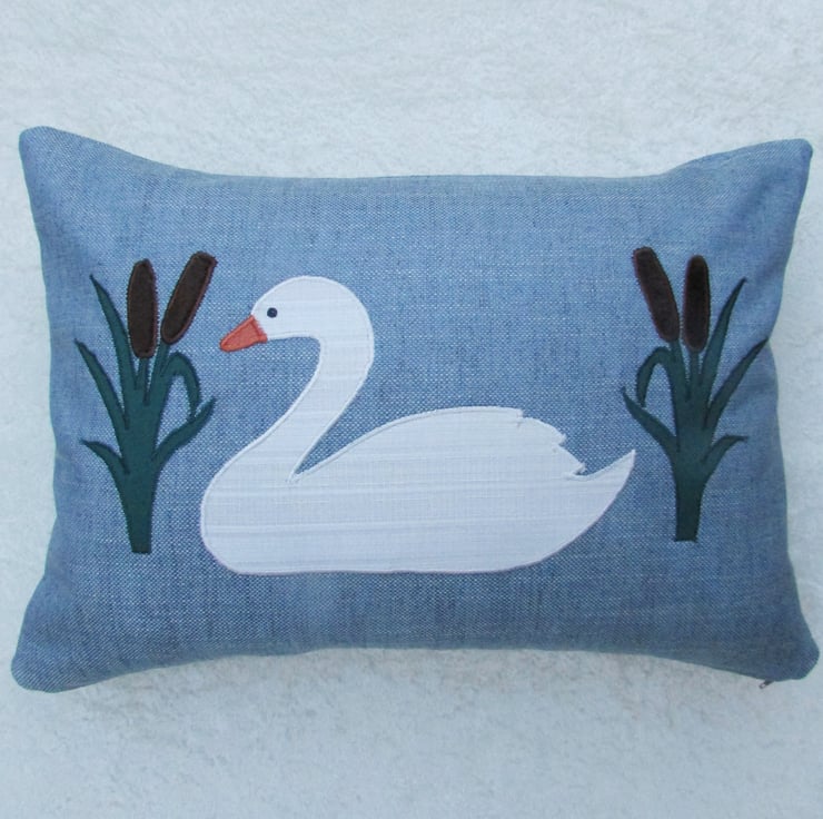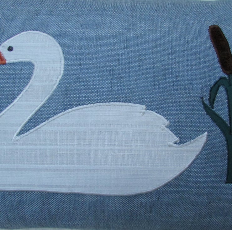 A blue rectangular cushion with applique swan and bulrushes. The swan is made from ivory fabric with a woven striped pattern and has an orange beak and a black sequin eye. The bulrushes are made from jade green fabric and a luxurious tactile brown velvet-finish fabric. The applique design is finished with machined satin stitch in good quality thread.