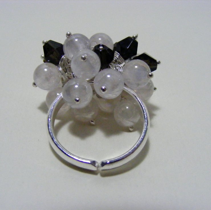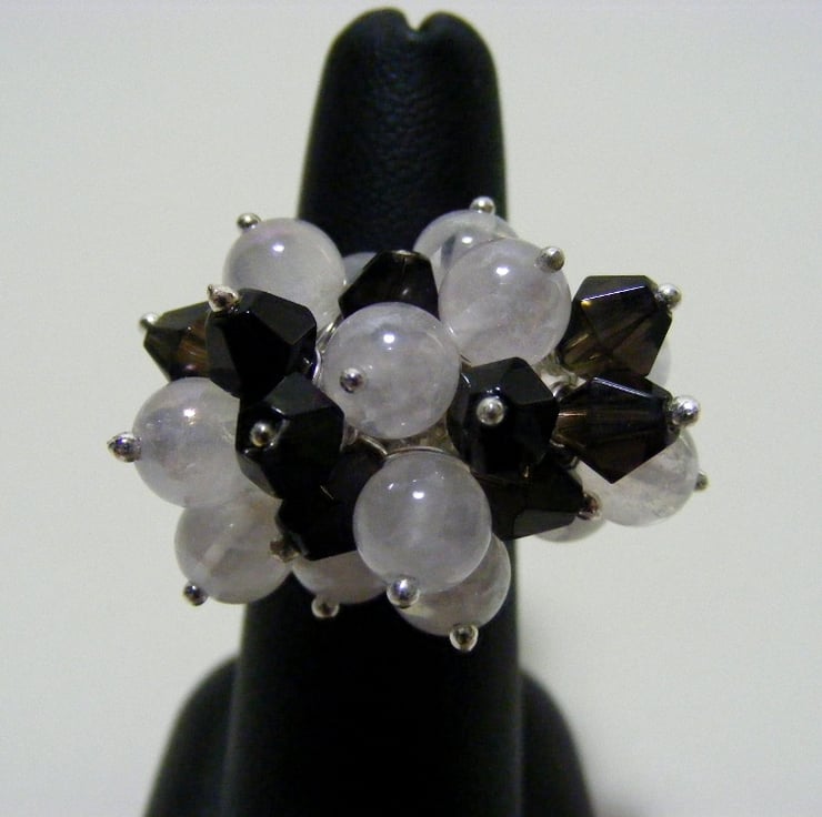 I have made this semi precious gemstone ring by wire wrapping 6 mm mystic rose quartz plain rounds and 6 mm smokey quartz bicones onto a 3 loop silver plated adjustable ring. Ball headpins are also silver plated.
