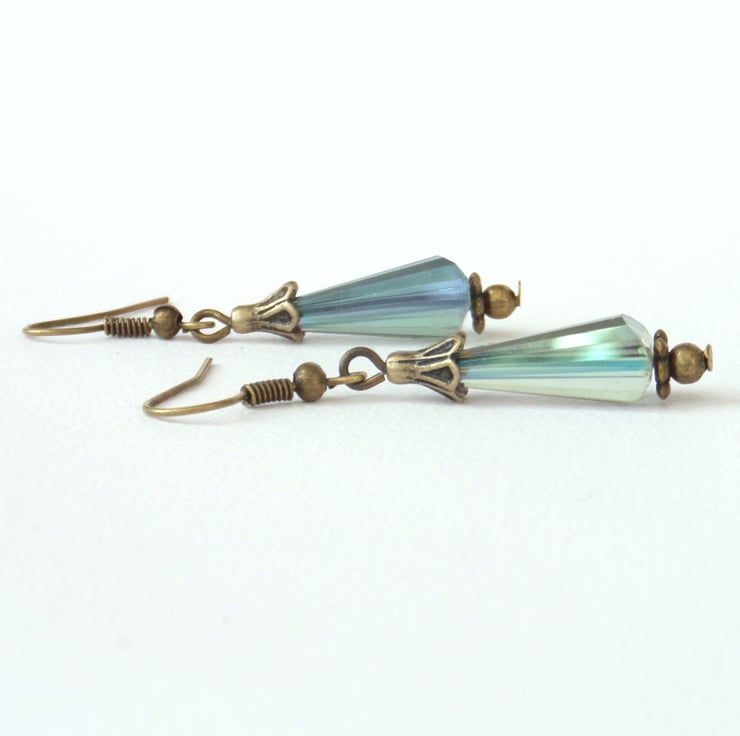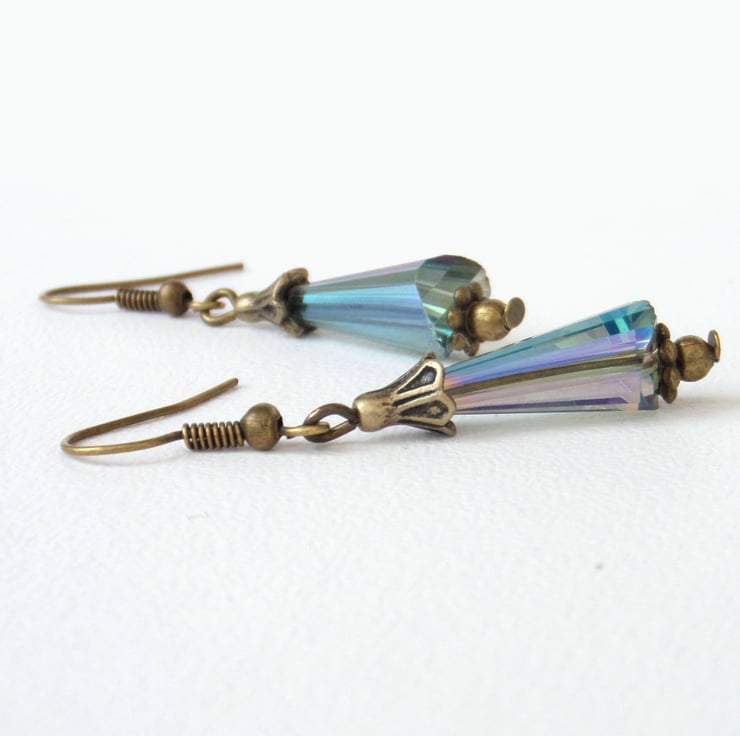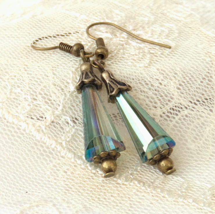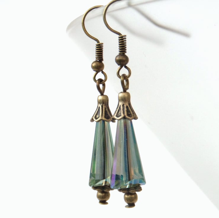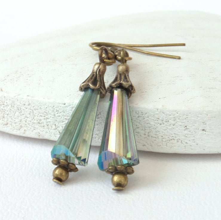 Beautiful crystal drops, with a green tint and rainbow hues, that hang with dainty bronze beadcaps from bronze wires.