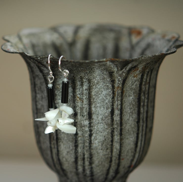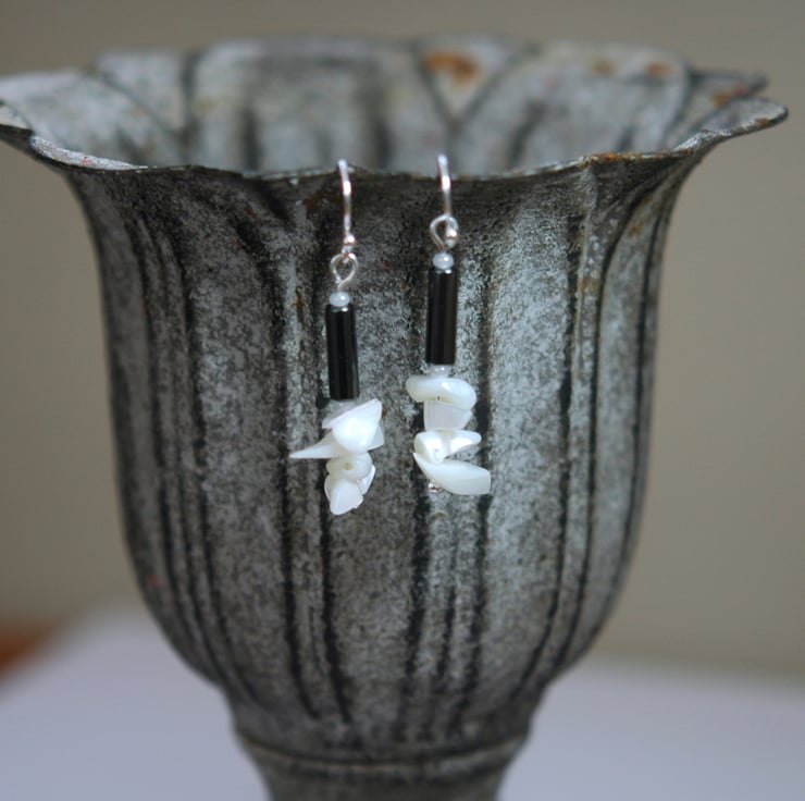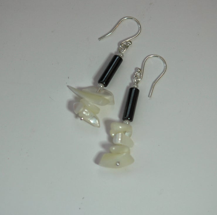 These distinctive sterling silver drop earrings feature glossy charcoal grey haematite tube beads complemented by creamy white Mother of Pearl chips with a lovely iridescent sheen. The drop from the bottom of the hook is 3.5cm, 11/2in. The beads are mounted on hand made sterling silver head pins which dangle from simple but elegant ear hooks stamped 925 for sterling. A matching necklace is available from my Folksy shop, URL https://folksy.com/items/6883539-Haematite-and-Mother-of-Pearl-Gemstone-Necklace-with-Sterling-Silver-P168.
