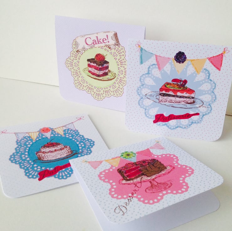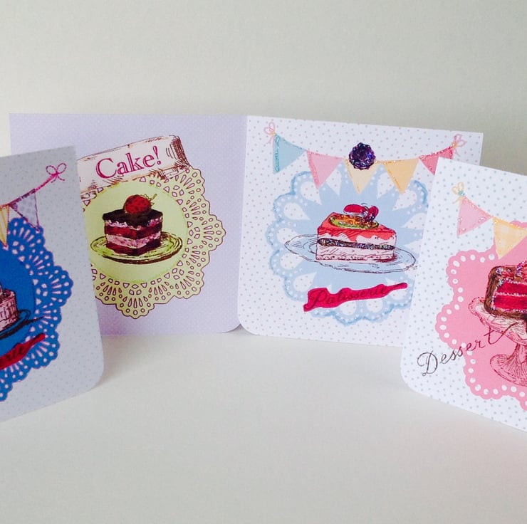 A set of four four notecards with envelopes delicately designed in a Patisserie theme.